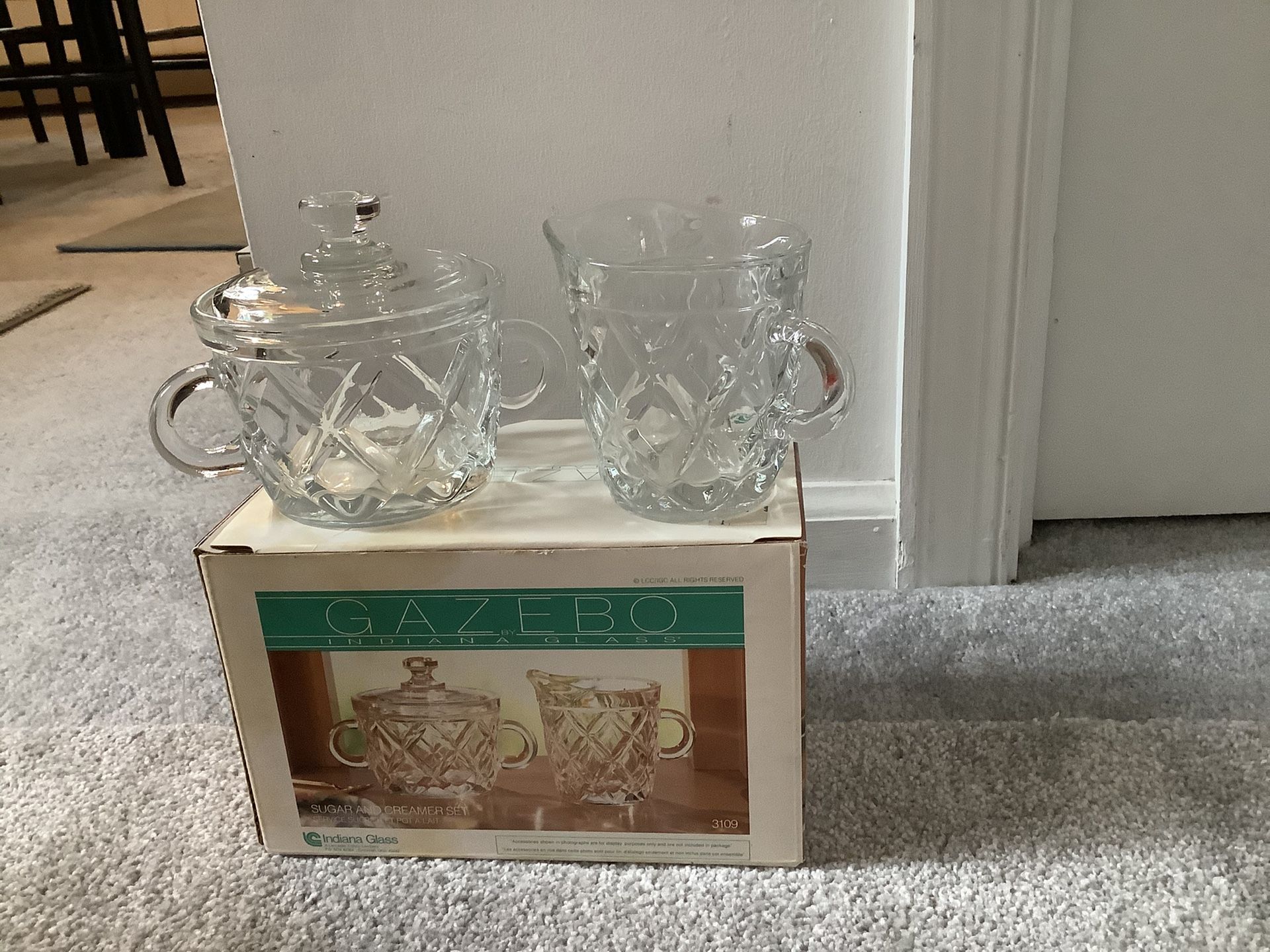 This is a vintage sugar and creamer set by the Indiana Glass Company. The pattern is Gazebo. It is new in the original box never been used. There are three pieces, the sugar bowl, the lid and the creamer.