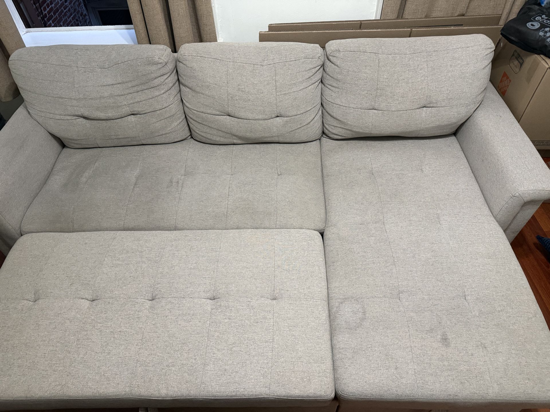 Gray sleeper sofa (Queen size) with storage. Need gone before 3/19 move out sale. Pick up only!