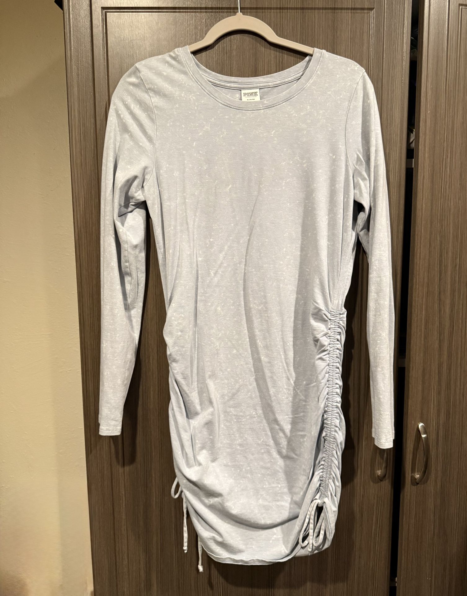 Pink faux Acid Washed Long Sleeve Ruffle Side Dress (M). Has a faint blue color to it with that worn in denim acid wash look to it. Pull strings on side add ruffle to the waist and butt and allow you to control how long or short the dress is. Stretchy material.