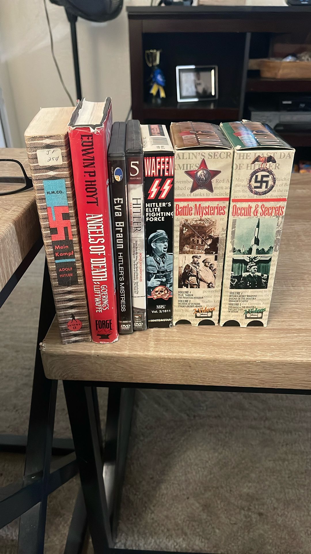 1: angels of death book 2: mein kampt by hitler book (8th printing) 3: the war zone dvd 4: hitler’s rise of evil dvd 5: waffen ss vhs 6: unsolved mysteries ww2 “battle mysteries “ 7: unsolved mysteries “occult & secrets”
