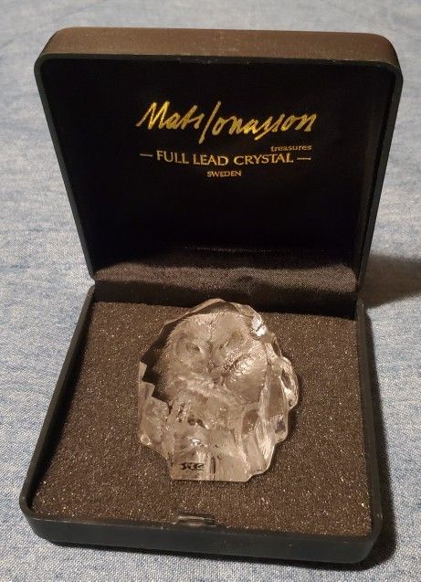 Mats Jonasson Crystal Owl Paperweight Sweden Signed Original Box & Sticker