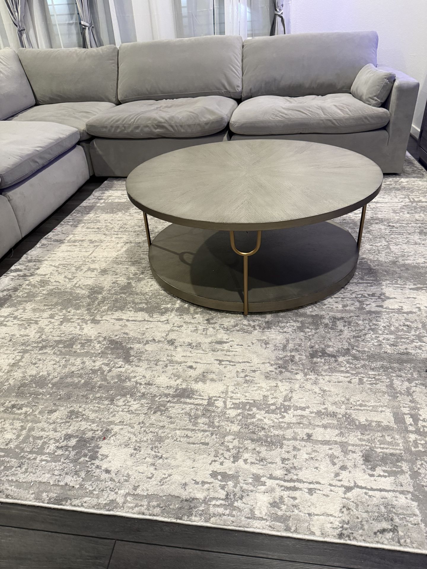 This is the Ranoka Round Cocktail Table, known for its high-end contemporary look. It features a beautiful platinum-finished wood veneer with a radial sunburst pattern on top. The gold-tone metal legs add a touch of "modern glam" that fits perfectly with grey, white, or neutral decor. Features: Two-Tier Storage: Large open lower shelf is perfect for baskets, books, or decor. Easy Mobility: Includes hidden casters (wheels) underneath, making it super easy to move for cleaning or movie nights. Sturdy Build: High-quality wood veneer and tubular metal frame. Condition: Like new / No scratches / Dimensions: Diameter: 42 inches Height: 17 inches