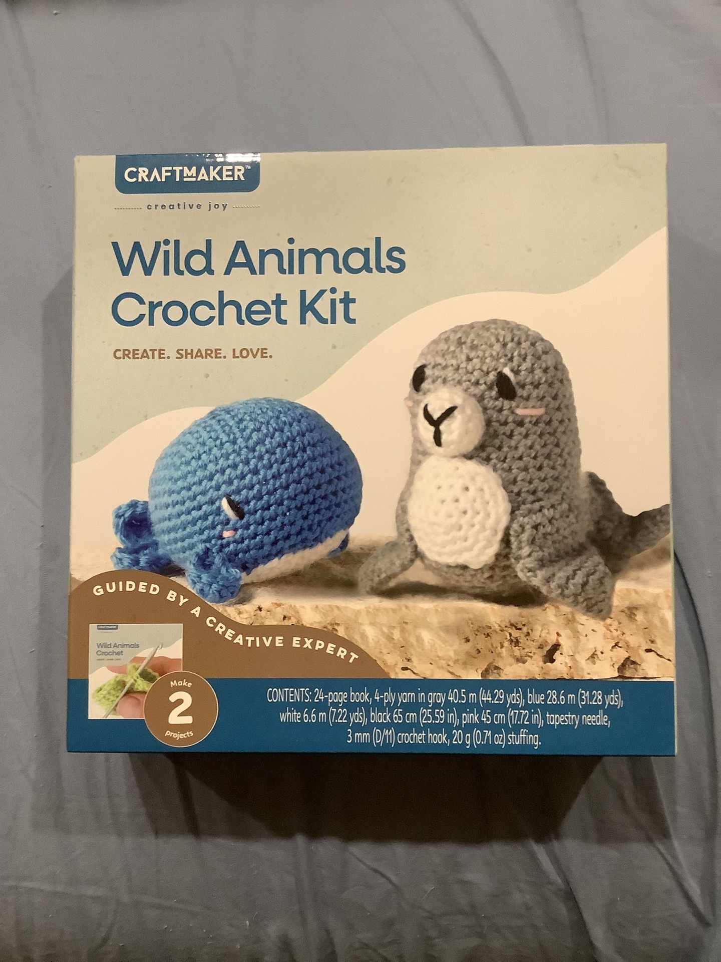 Wild animal crochet kit (supplies for two animals). Includes hook, yarn, stuffing, and instruction manual. New.
