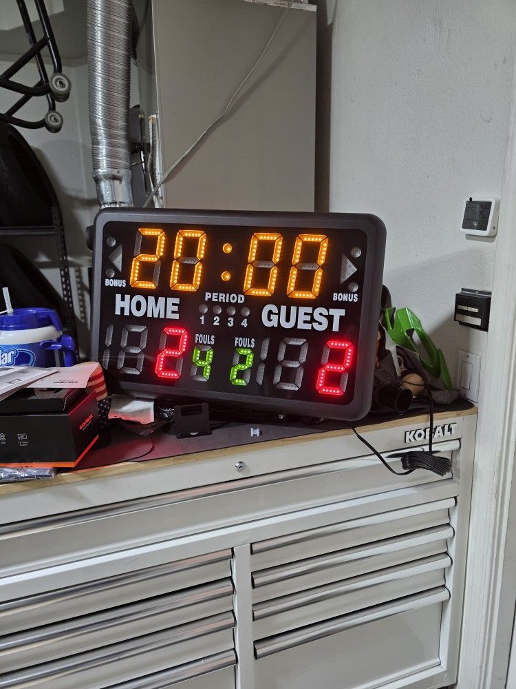 Multi-game digital scoreboard with wireless remote Can also be set up and controlled from rear panel. Measures 16×24 inches. Extremely bright and loud when timer counts down. Seemed like a good idea when I bought it but never used it. In perfect working order with remote and user manual. These cost $485 new. Asking $250