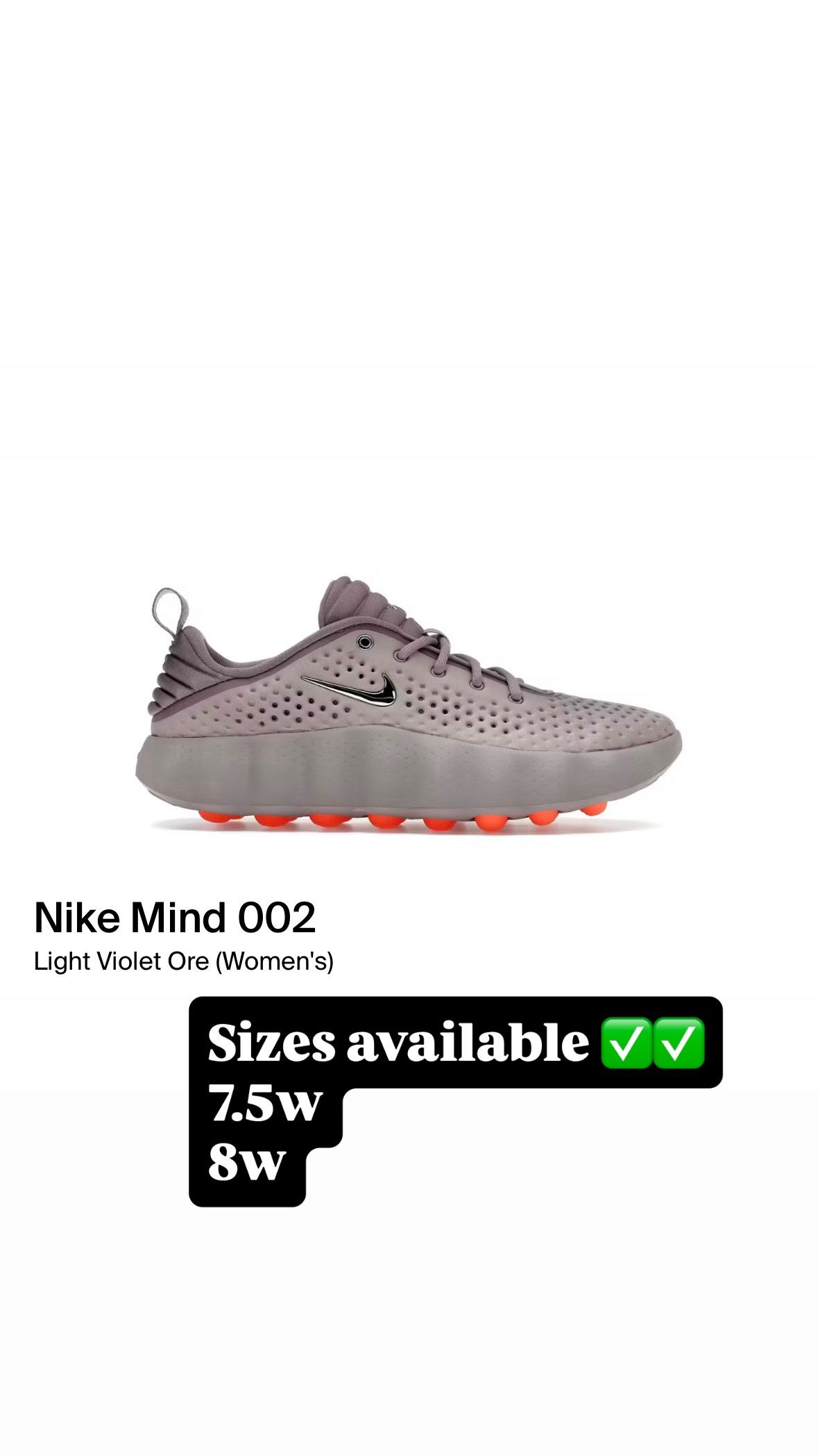 Sizes 7.5w, & 8w Nike Mind 002 Light Violet Ore (Women's). Brand new shoes. 100% og all. Pick up location hicksville. NO TRADES. All sales final. ❌No deposit, no holds❌