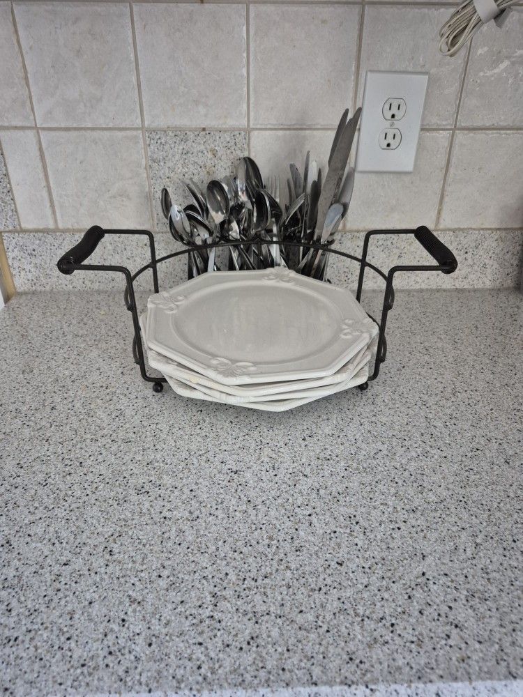 Keep your plates and silverware in one convenient spot. There are 4 white 11 Inch dinner plates, 11 teaspoons, 8 long handle teaspoons, 8 table spoons, 2 serving spoons, long handle stirring spoons, 6 small forks, 6 steak forks, 8 knives, 6 butter knives, and 1 long knife. The holder is black strong metal.