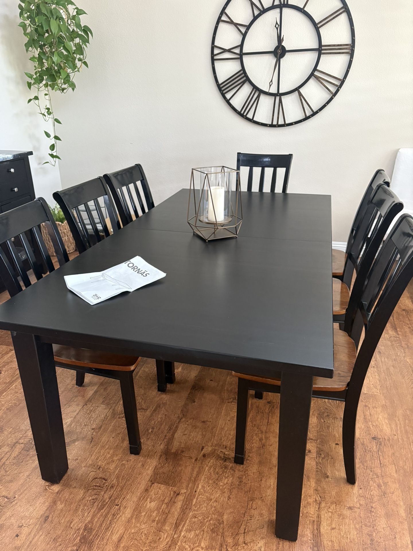 Solid wood IKEA “stornas” table (black brown stain) with 2 leaves. 79”x49”, can extend to 115” with both leaves. Seats 12 when fully extended. Chairs are also solid wood and very sturdy.