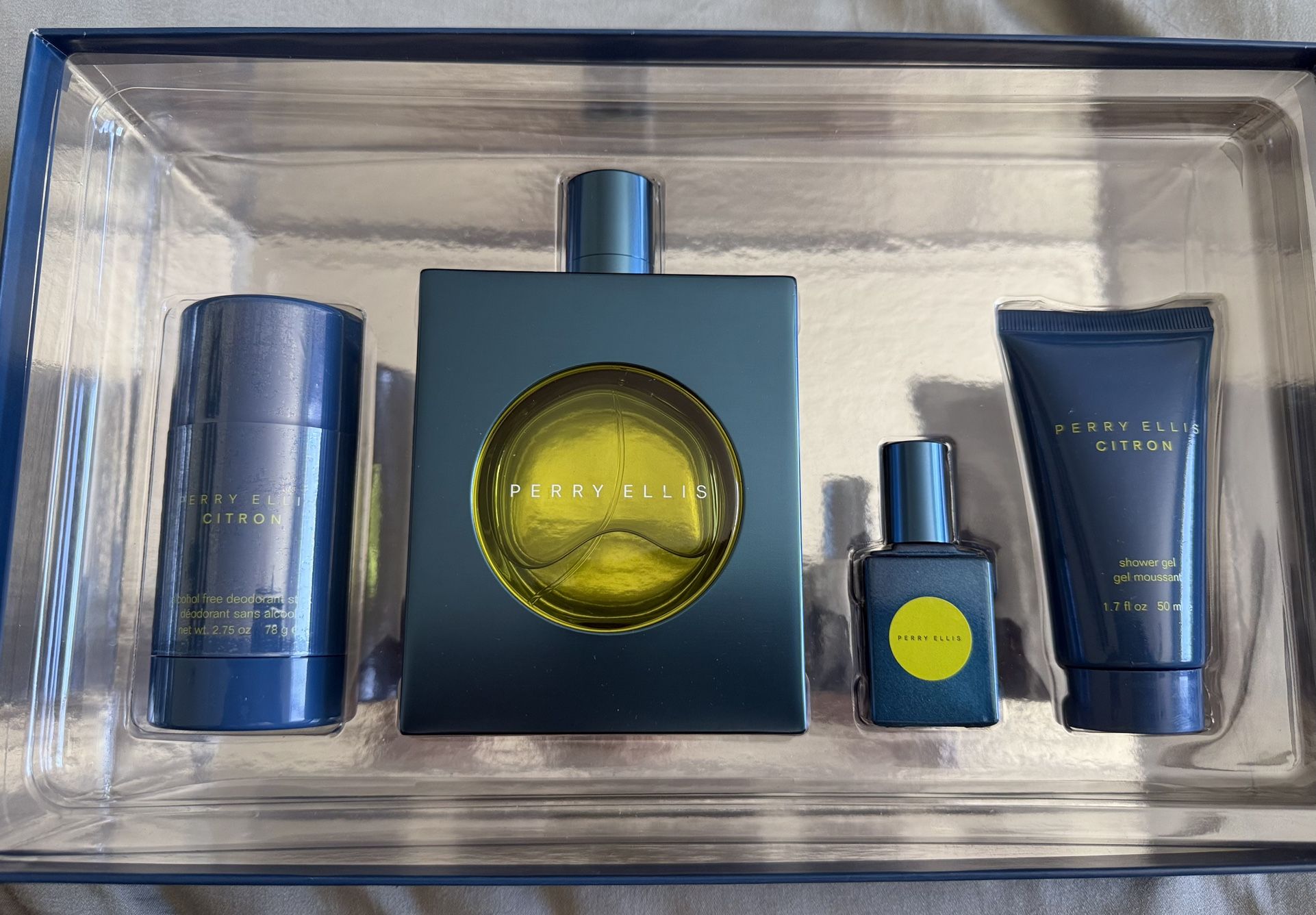 Perry Ellis Citron 3.4 oz Toilette Spray Four Piece Gift Set Unused open box. Refreshing citron fragrance 3.4 oz. Eau de Toilette Spray 2.75 oz Deodorizing alcohol free stick 1.75 oz Shower Gel .25 oz EDT Mini Spray