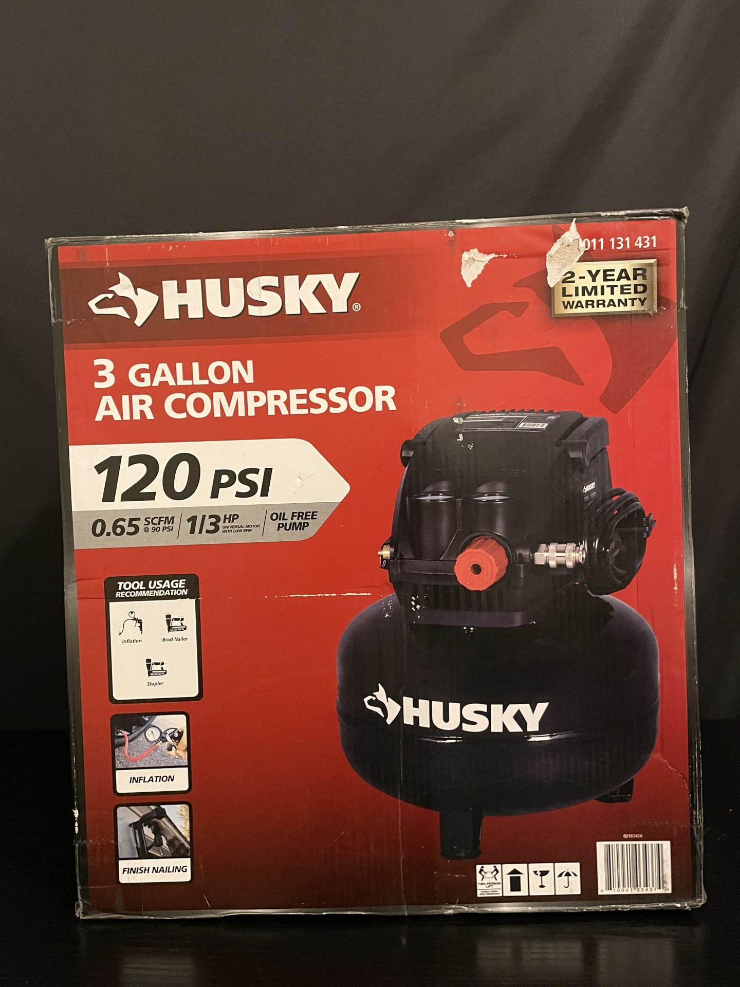 Husky 3 Gal. 120 PSI Portable Electric Oil-Free Light Duty Pancake Air Compressor with Fold Down Handle and 1-Quick Coupler