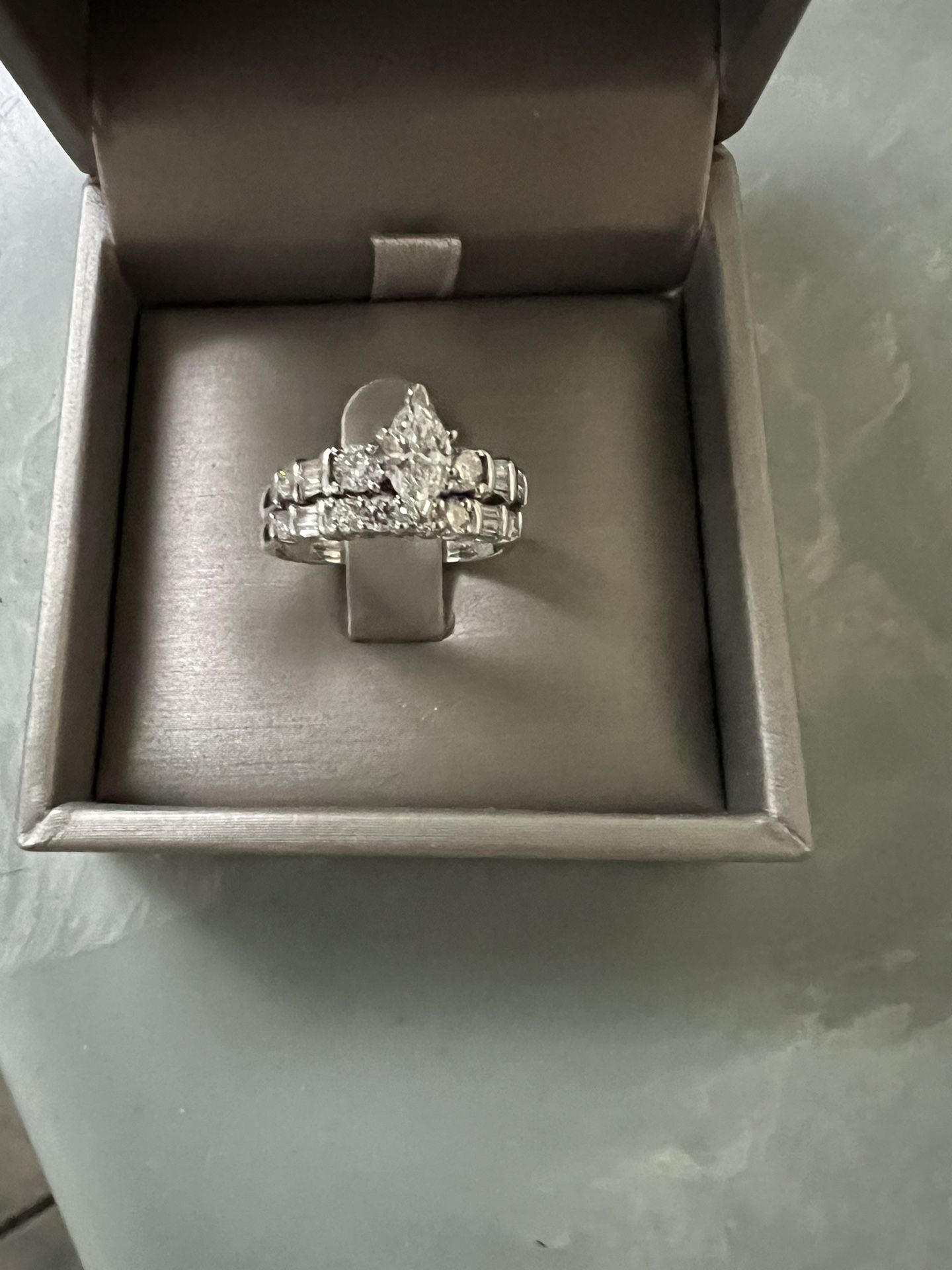 1/4 ct center marquise center diamond with mixture of round diamonds and baguettes for side diamonds Setting is 5-6 in size Plenty of compliments on unique design So let’s make a deal. I have receipt for new center diamond showing clarity/size/color and value, also new prongs were installed when diamond was replaced