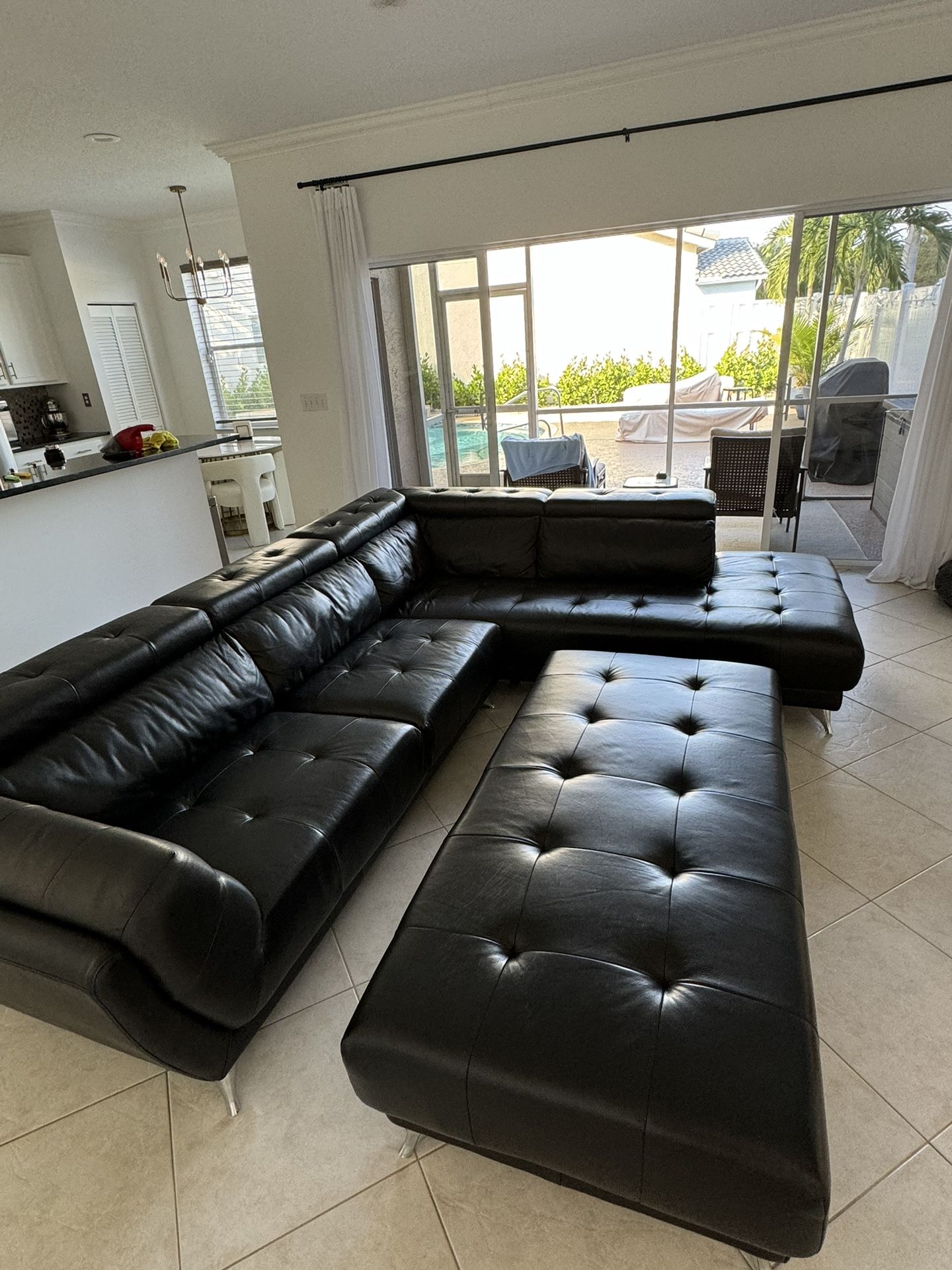 Dolcedo Sectional Couch with Chaise + Ottoman Rooms to Go Top Grain Leather 3 adjustable headrests (5 customizable positions) 2 hidden storage compartments Tufted seats, backside cushions, + chrome legs Dimensions: 118.5”W x 94”D x 36”H Hypoallergenic dog home Minor markings from dog paws (shown in pics)