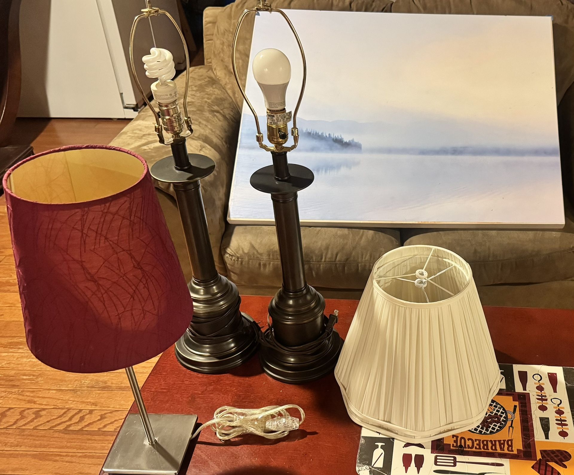 For sale: - 1 Painting - 2 Matching lamps - 1 Side lamp - 2 Extra lampshades (can be used with any lamp) All 4 items for $20. If purchased separately, each item is $5. First come, first served. Cash only, please. I'm moving, so these items must go. Thank you for your interest!