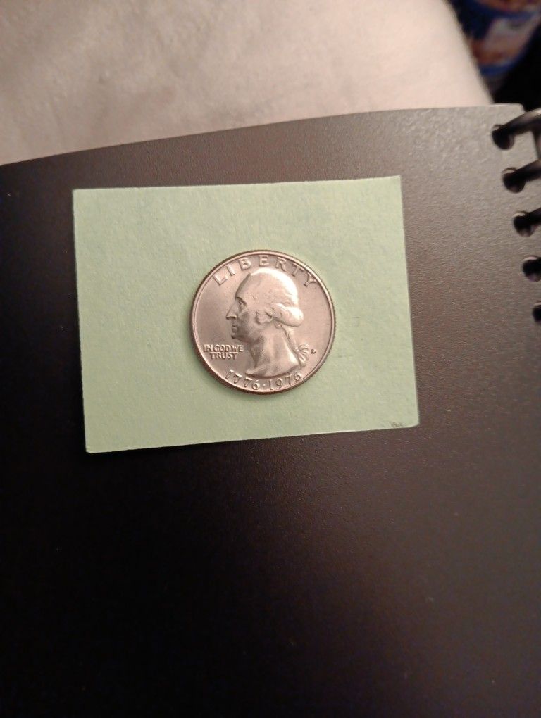 1976 D Bicentennial quarter. "D" mint mark. Washington's image on the coin includes a clear halo stamped into the coin completely around the image. Pristine condition.