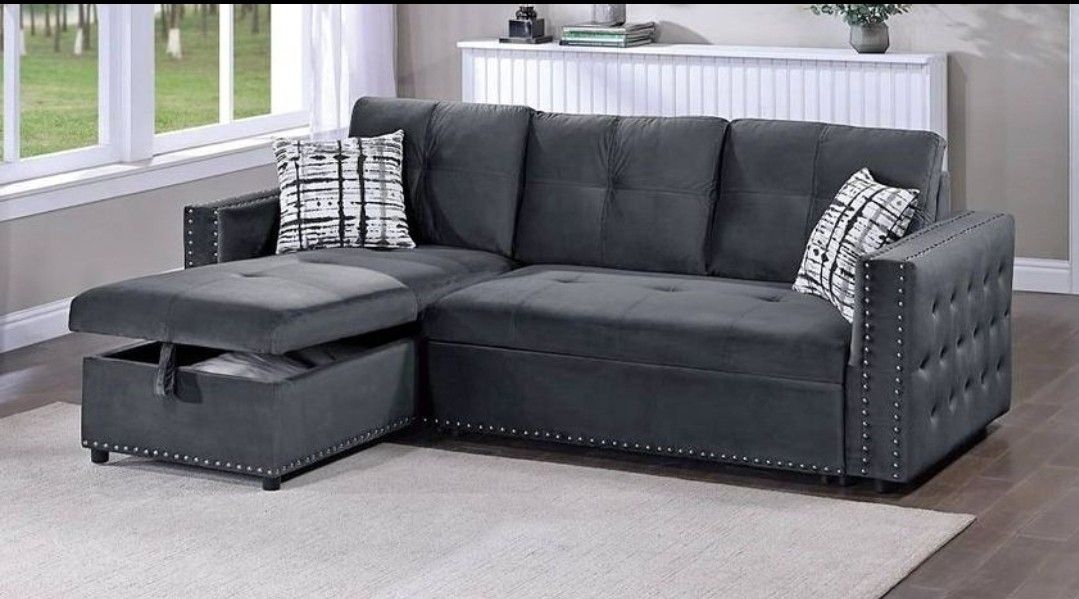 sectional sofa set pull out sleep area with reversible pop up storage chaise Sectional measures 90" x 61" L Chaise x 35" H Finance Available No Credit Check No Down Payment No Interest Lowest Price Guarantee 12125 Day St B203 Moreno Valley Ca