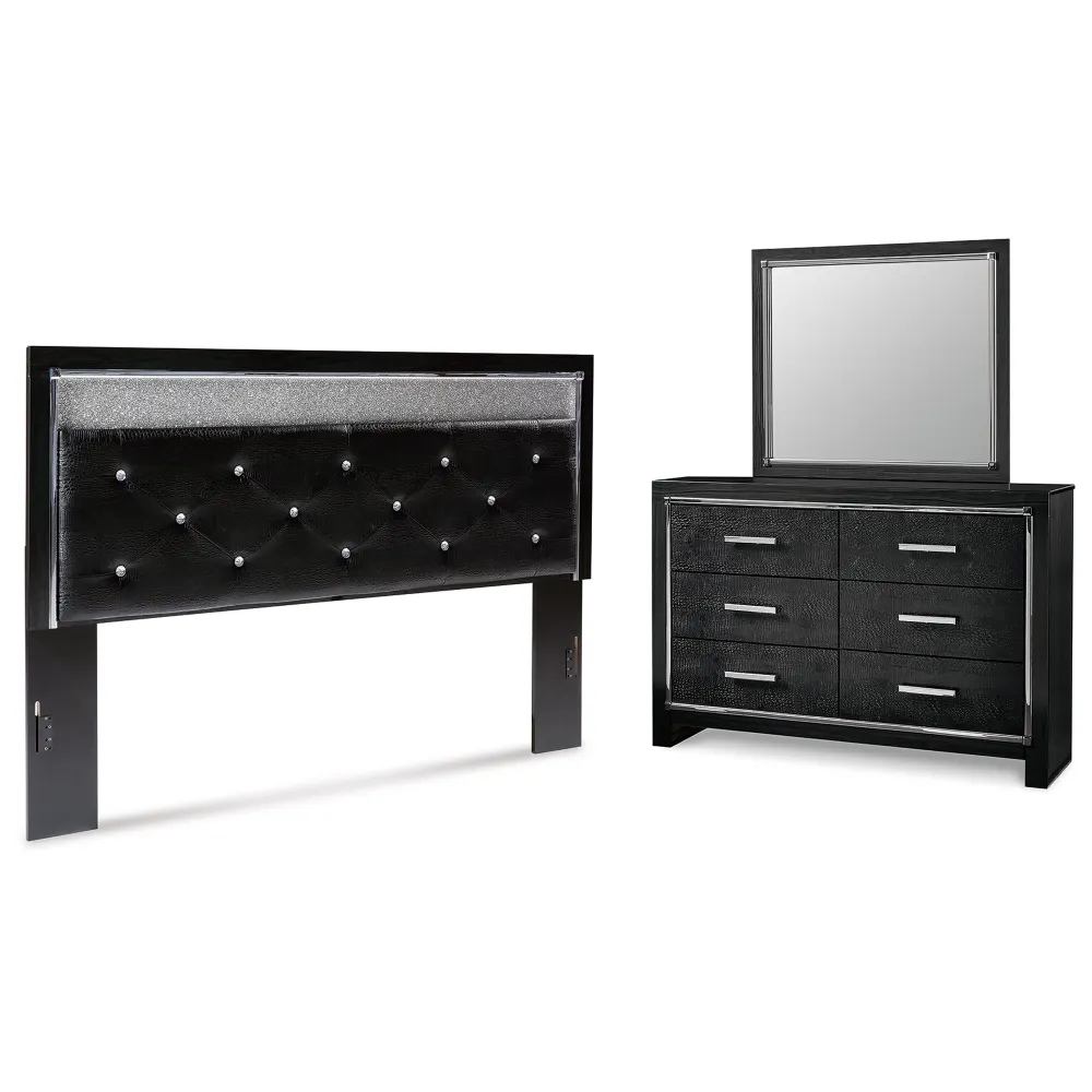 Kaydell King Upholstered Panel Headboard with Mirrored Dresser Ultimate Bargain Blowout