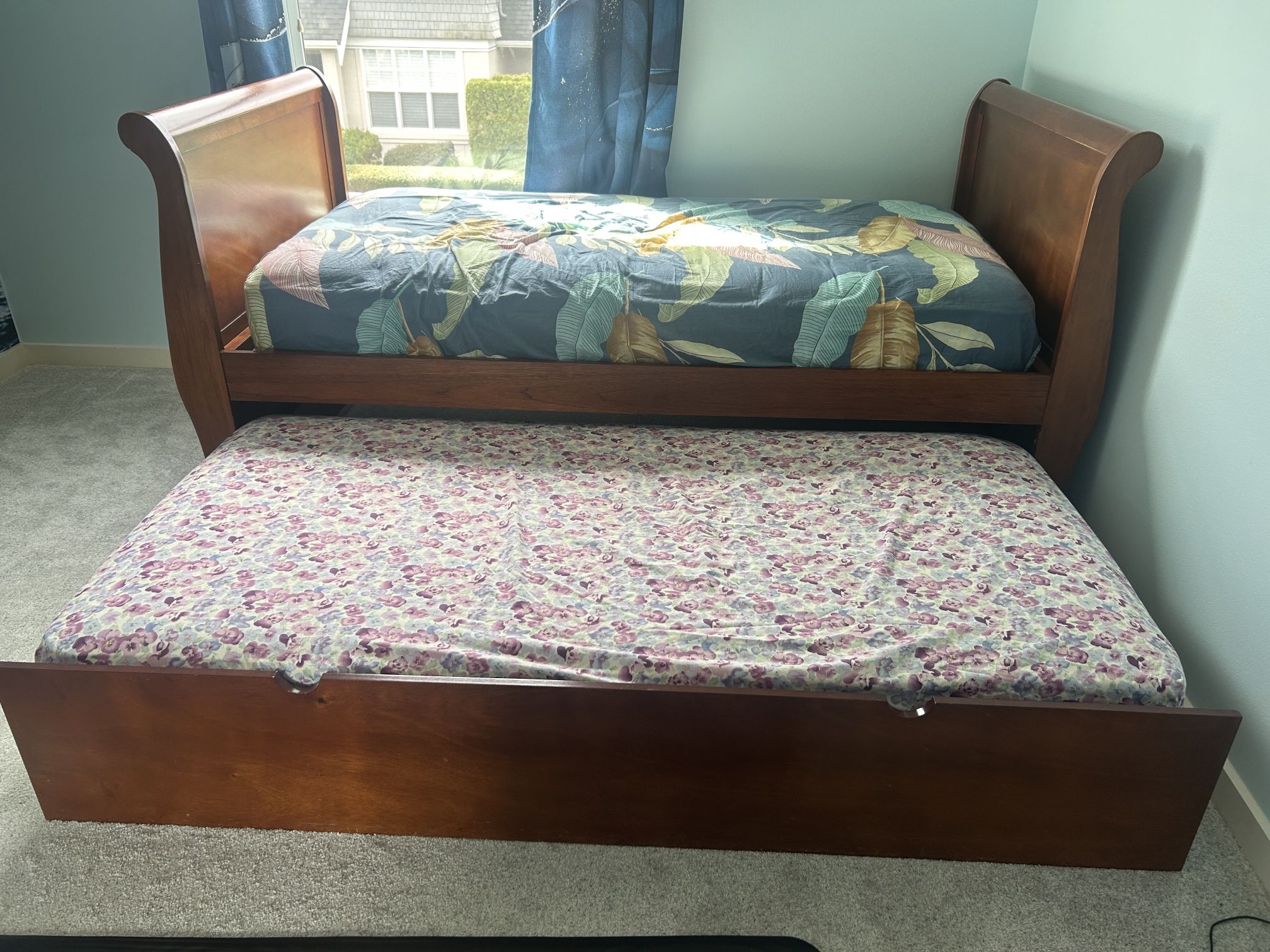 Cherry-finished sleigh-style daybed with trundl - Trundle Bed- Twin Bed Wooden Bed With Pull Out Trundle