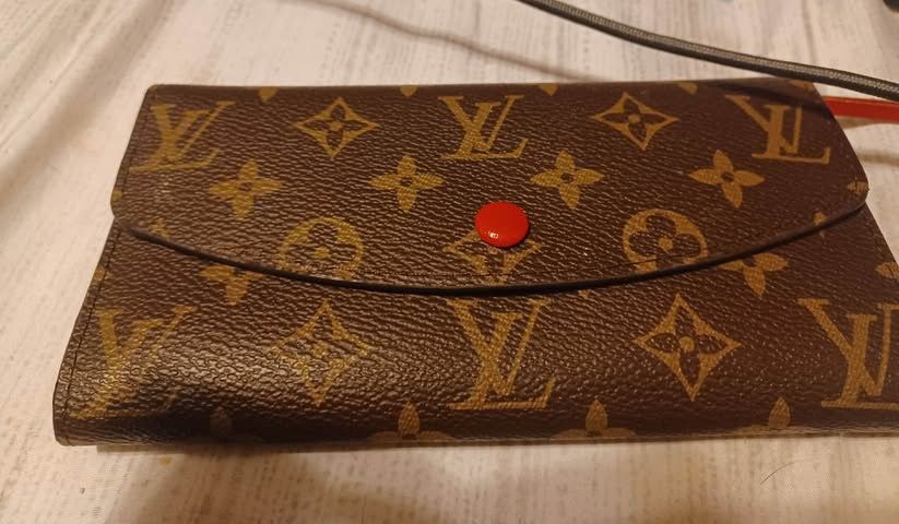 Classic Louis Vuitton monogram wallet in excellent condition and rarely used. Brown exterior with a vibrant red interior. Snap closure. Inside has card slots and a zipper compartment.