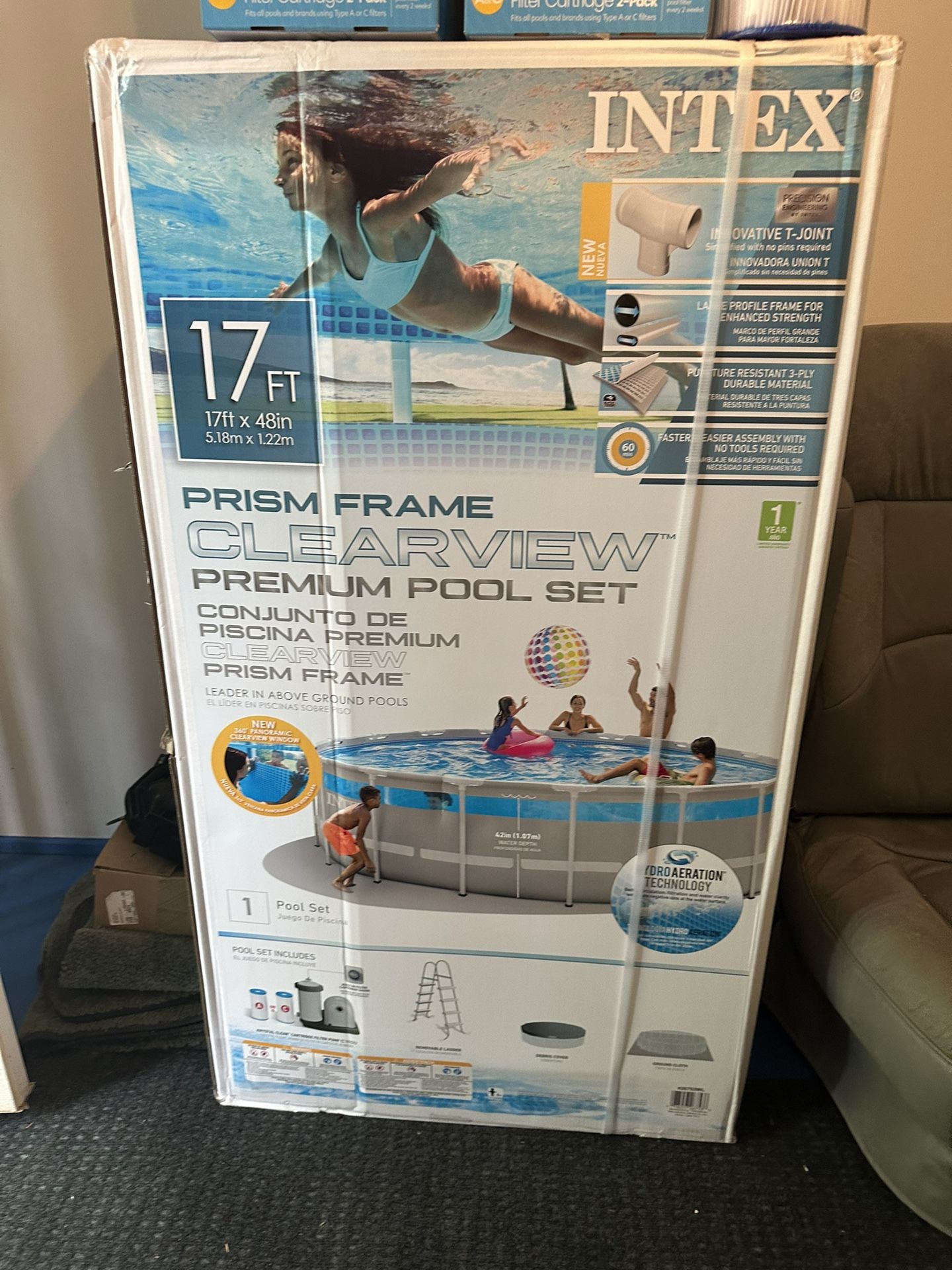 Just in time for the spring!!! You don’t want to miss out on this brand new, never opened pool. Features puncture resistant 3-ply, durable material and strong powder coated steel tubing for extra strength and stability. Includes a pool cover, ground cloth, removable ladder, and a 1500 GHP filter pump for immediate use. This easy set up design will be pool ready for water in no time. It measures 17 feet in diameter and 48 inches in height, maximum water depth of 42 inches.