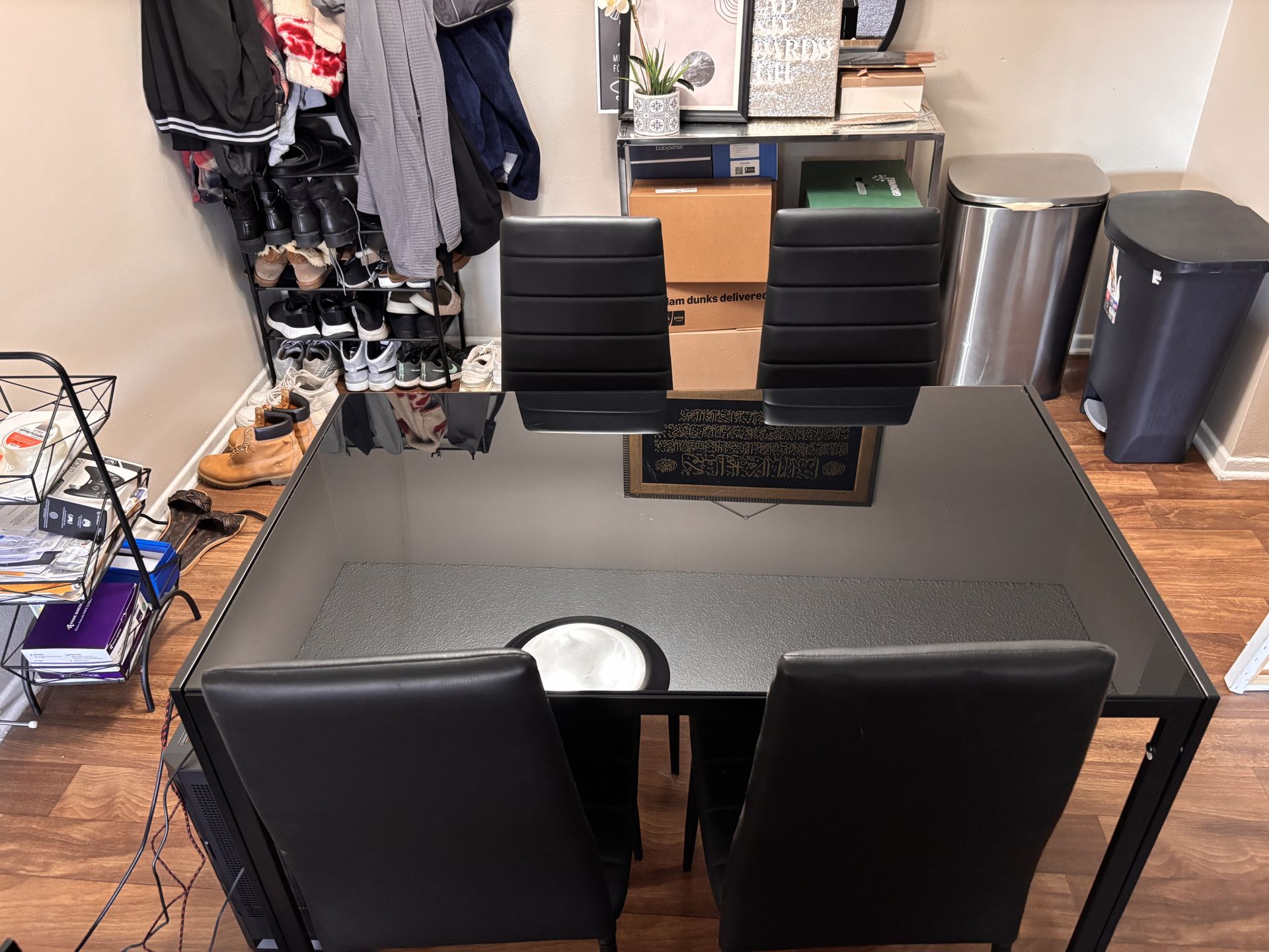 Modern black glass dining table set with 4 matching chairs. Tempered glass top with sturdy frame and comfortable padded high-back chairs. Seats 6 people. Clean and in great condition. Only selling to make space. Easy to transport. Price is negotiable.