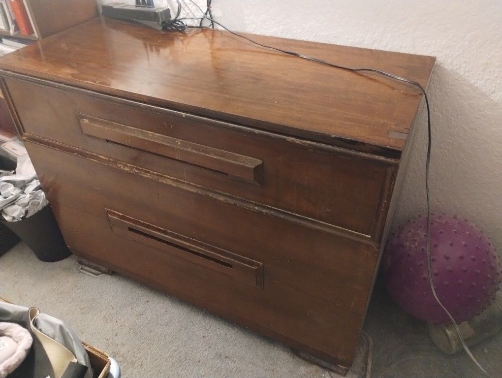 Very unique. Collectible. Sturdy and strong. 3 drawers 8-9" deep. 46" wide. 20" deep. 35" tall. All wood. Couple of scratches. Dovetail joints. Real wood laminate. Very well built. May have been built by the Amish or Mennonites. No holds. Too many no shows. Will remove once it is sold.