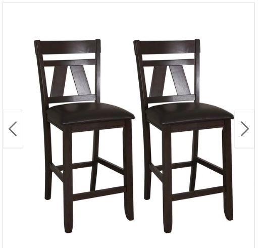Details: Sit in comfort with the Lawson splat back counter chair. Crafted of rubberwood solids, this piece showcases transitional styling and features a chocolate PVC upholstery, nylon chair glides to protect your flooring, and users can enjoy the convenience of the consumer-friendly assembly. The dark expresso finish creates a look that is sure to pair beautifully with any décor in your home. Features: Set includes: Two (2) barstools Materials: Rubberwood Solids and Walnut Veneers, PVC Finish: Dark Espresso finish Special Features: Upholstered in chocolate PVC Consumer friendly assembly Nylon chair glides Dimensions: Barstool dimensions: 20 inches width x 21 inches depth x 41 inches height Seat to Floor: 25.5" Seat Frame: 1-3/4" W x 3/4" H