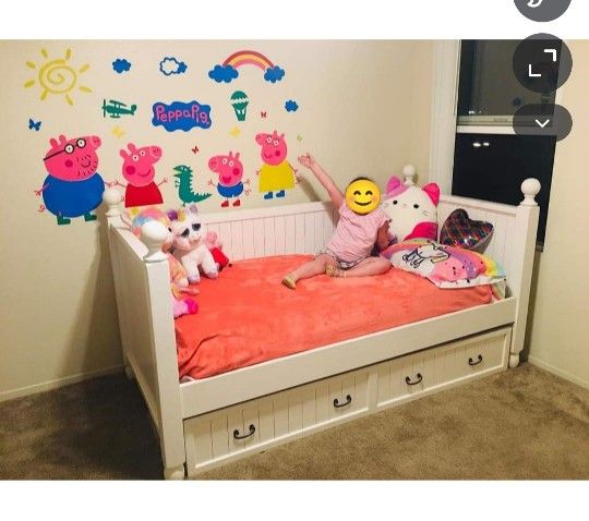 Frame itself is in good condition No pull-out trundle Only issue is the plywood support is too small by an inch or so and needs replacing (an easy fix) My daughter has been using the bed without any problems for couple years, except if she jumps near the end I have to adjust the plywood which takes 1 minute. If the plywood isn’t replaced, just be aware you may need to occasionally adjust the end of the bed.