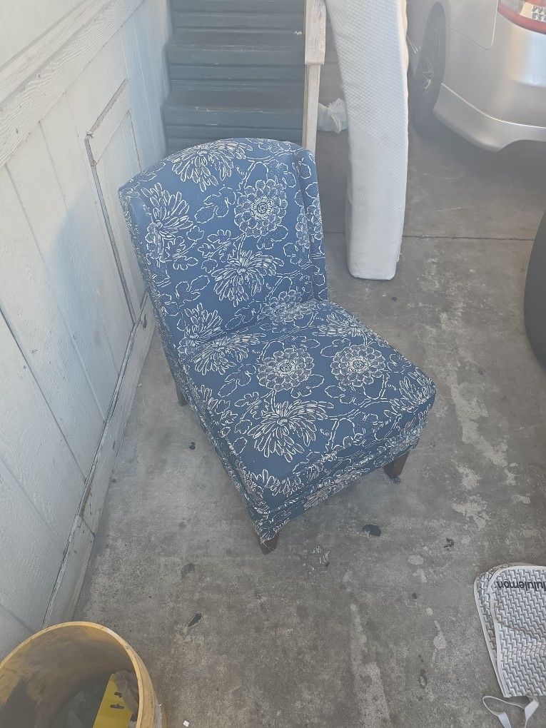 Armless, Chinoiserie-style, Chrysanthemum print, Tapered wooden legs. Good condition. Wood chips on the legs but minor wear and tear