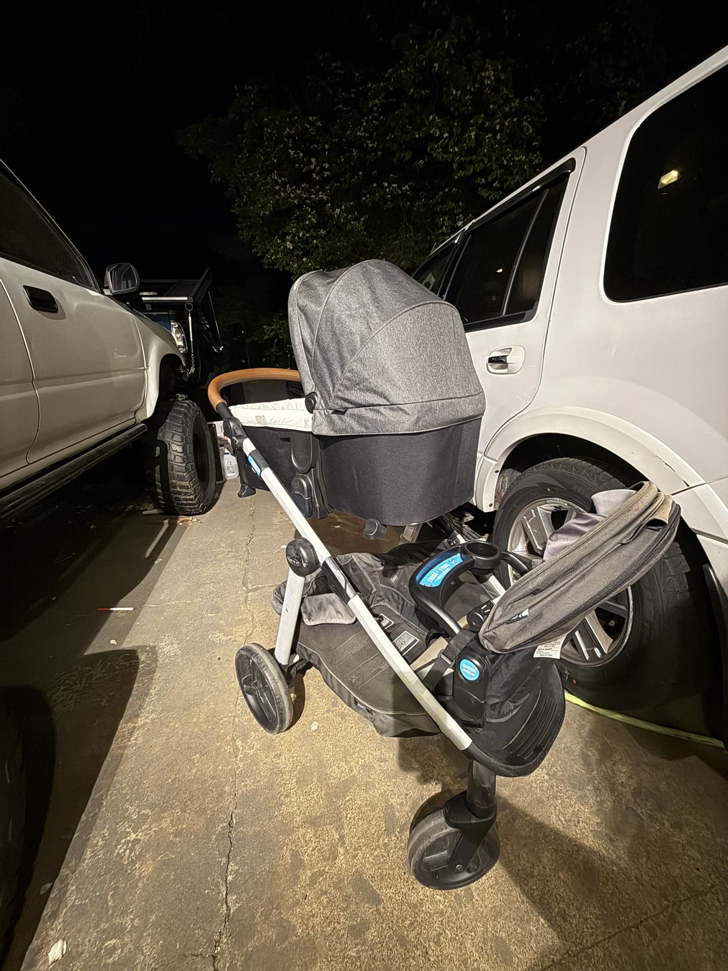 Stroller has many configurations, comes with the bassinet and one toddler rumble seat you can buy the other toddler seat so that they can bowl have toddler seats or you can use a car seat that is compatible I think the Graco or they have other adapters to make other ones fit you would have to order those. Just look up Graco modes nest2grow and you’ll see all the different accessories and ways to use. Has some sun fading on the toddler but I have some fabric dye. I was planning on dying the fabric, but figured I would just include it. Or I can dye the fabric for you if you would like.
