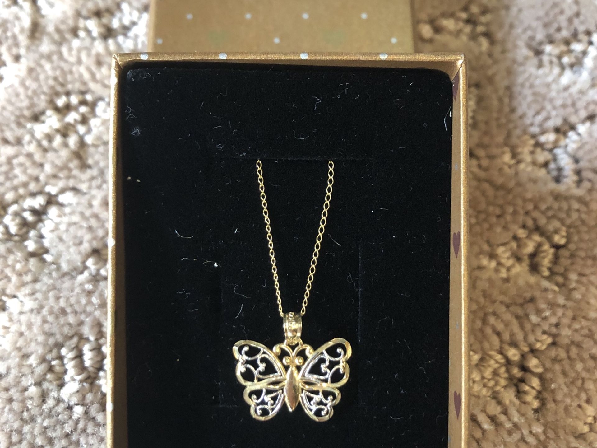Gold plated necklace with delicate butterfly pendant in gold and silver. 18 inch chain.