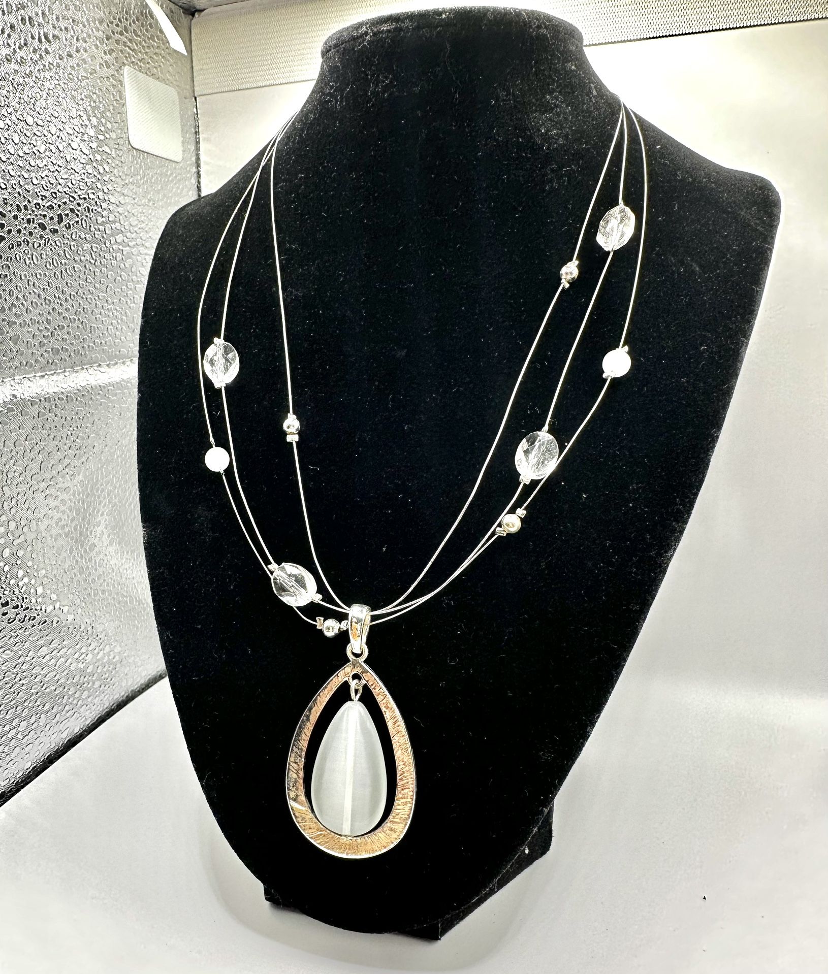 Pretty simple but elegant crystal and silver tiger eye shine pendant necklace with wire strings. Pendant is probably acrylic or glass of some kind. Great condition. Located in Ooltewah TN from a smoke free home