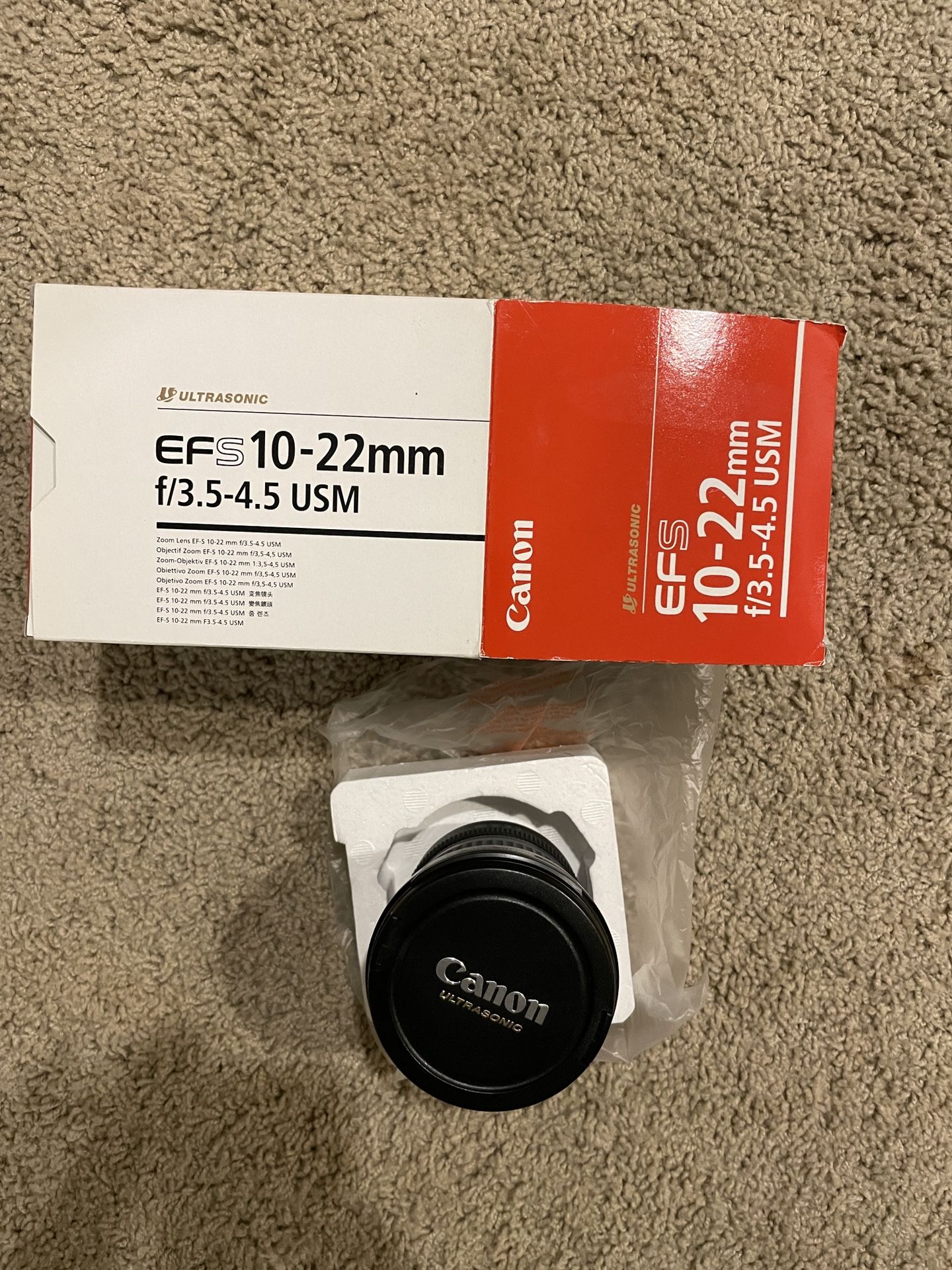 Canon EF-S 10-22mm f/3.5-4.5 USM SLR Lens for EOS Digital SLRs. Almost New. Comes with the box and all documentation as original. Got it as a gift and it’s too much of a lens for my skills.