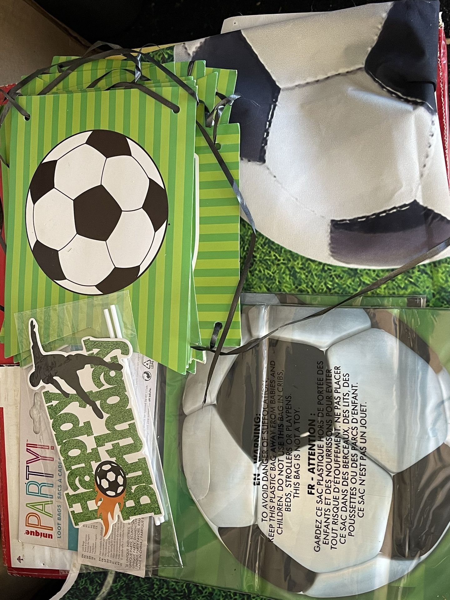 Soccer theme birthday supplies some new” unopened “ ( backdrop , hanging banner, cupcake toppers, loop bags,