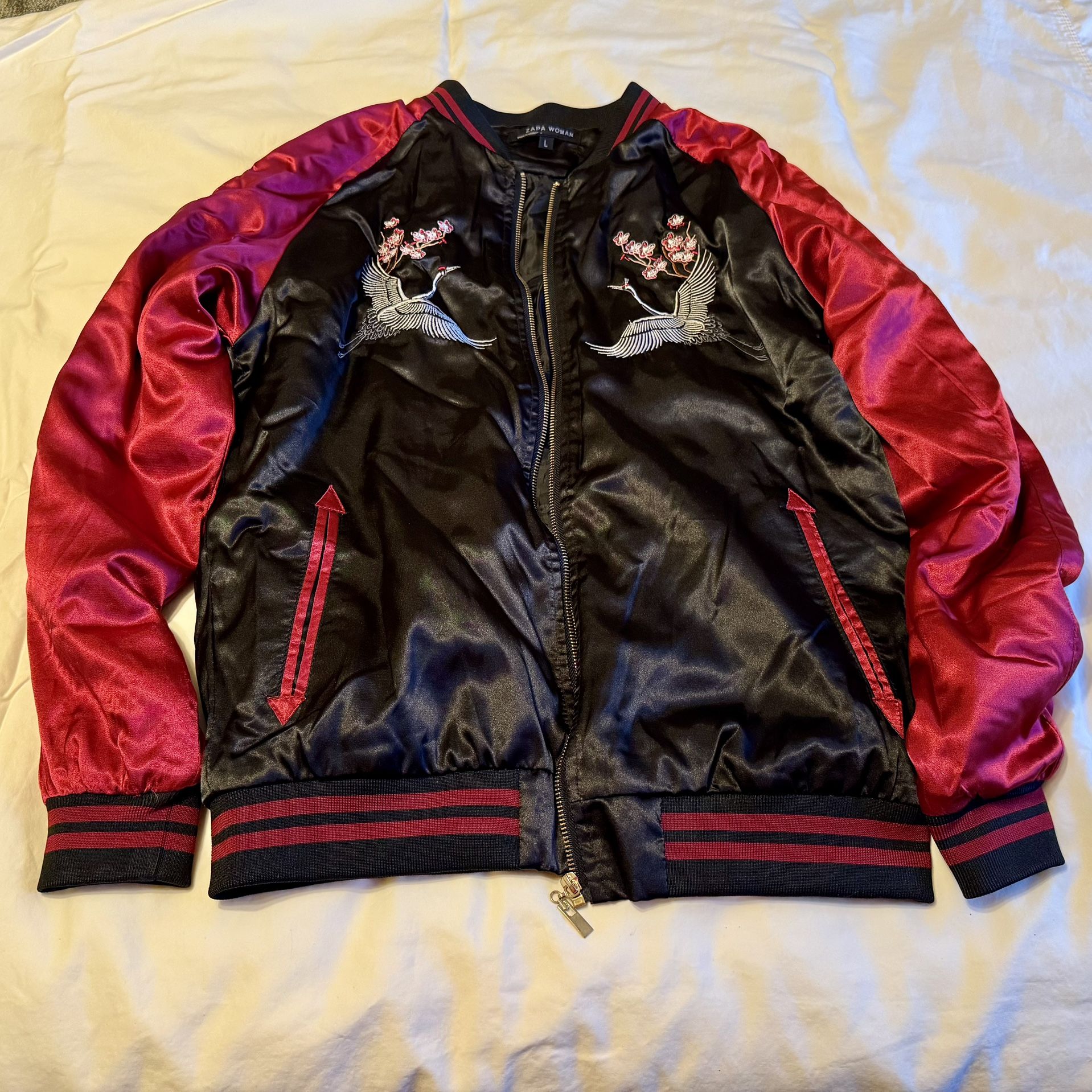 - Great as a Christmas/winter gift for teenage girls & young adult women - Never worn/new - Features embroidered cranes & cherry blossoms - Satin material with ribbed cuffs & waist - Unisex - can be worn by both men/women - Large size - Full zipper