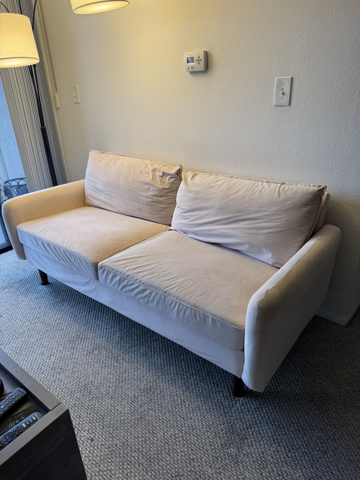 Couch with velcrow pillows, velvet material. Price negotiable, must sell asap.