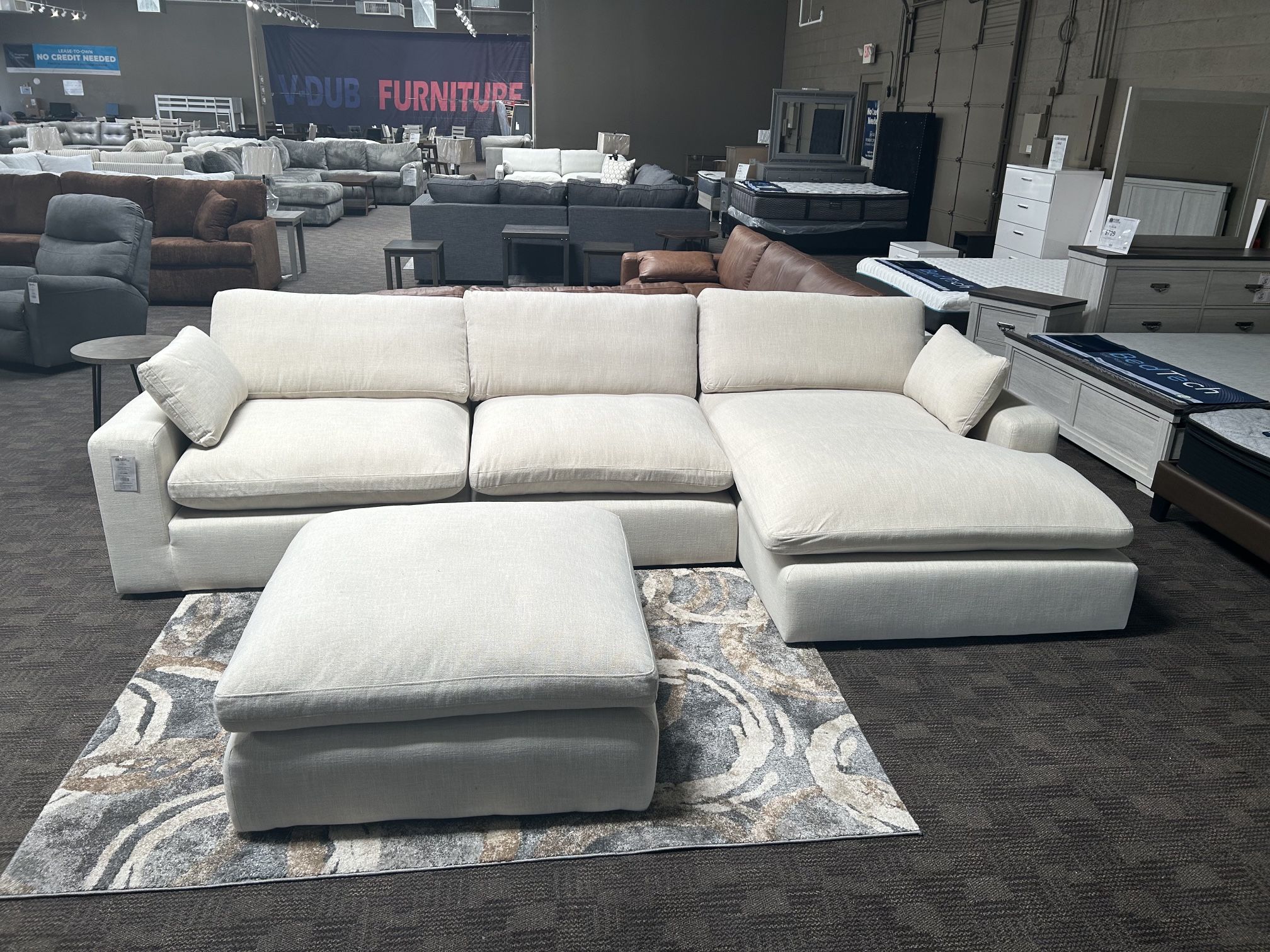 Brand new. Available for quick pick up or delivery. Throw pillows included. Velvet soft fabric. Deep cloud like comfort. Available in other configurations! 140” x 68” Ask about payment plans!