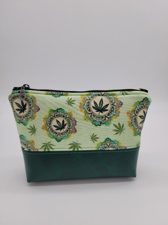 Super cute Marijuana print makeup bag. Has green vinyl at the bottom. And I used black waterproof canvas inside. The bag measures 9.5x7x2.