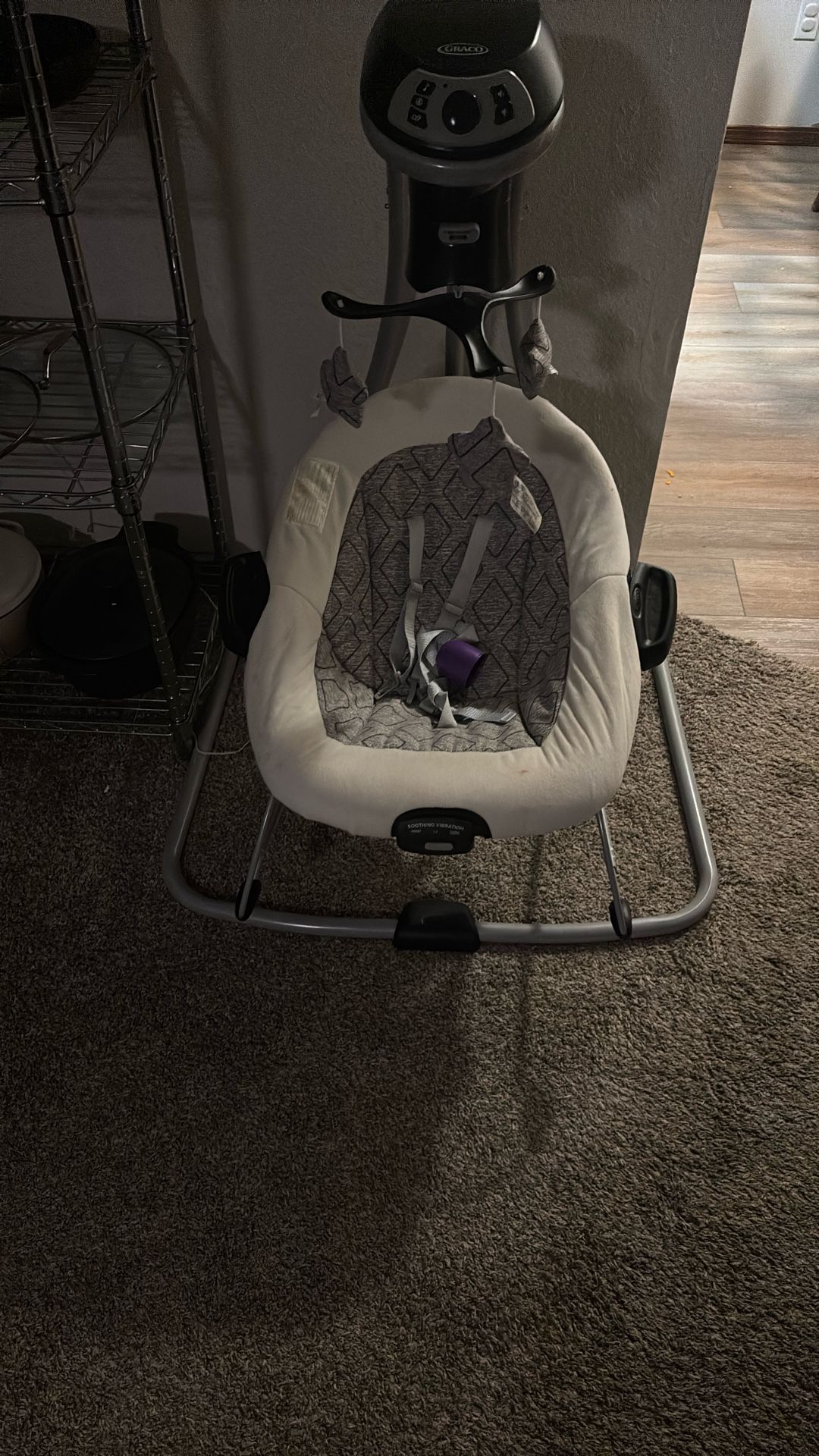 Swing with music and spinning toys to play with and it rocks back and forth. Great for moms who need a break from rocking a newborn !