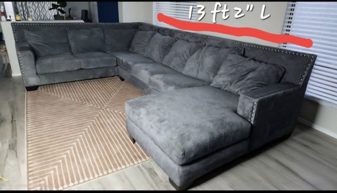 13 ft 3 in long Other end is 8.5 ft. Seats 7 comfortably. Best couch I have ever owned.