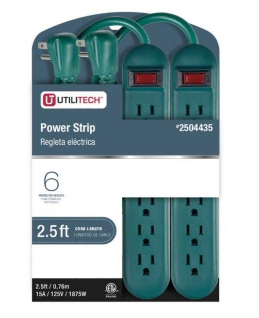 The 6-Outlet Power Strip brings you additional outlets to provide required electricity, It's the perfect cord to use with small appliances and electronics such as lamps, computers, printers and home theatre systems. Save power consumption with the handy circuit breaker switch, The 2.5-foot power cord gives you the added convenience of increased range from power outlets. Recommended for indoor use. • CIRCUIT BREAKER: Save power consumption with the handy circuit breaker switch • SIX GROUNDED OUTLETS: Six grounded outlets allow you to plug everything in, all in one place • POWER CORD: 2.5-foot power cord for increased range * INDOOOR USE: designed specifically for use inside and in dry locations • POWER AMPERAGE: UL rated for 15 amps, 125 volts, 1875 watts, 60 hz • GREEN FINISH: The green fmish is perfect for the Christmas season or to add a pop of color to your room • 3 available • NEW