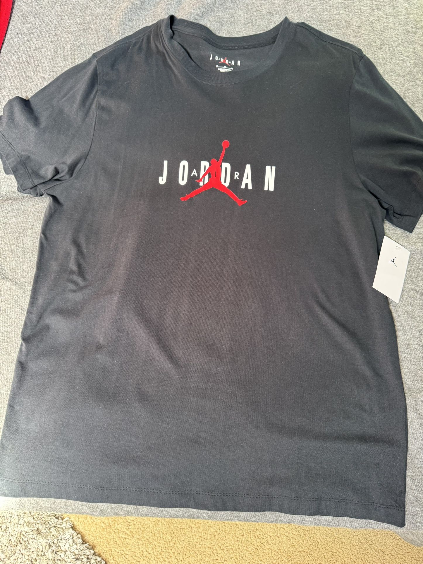 Men’s Air Jordan Shirt Size XL Black with white and red lettering it says Air Jordan front and back so when there behind you that will know you have a air Jordan shirt on So look good it’s size XL