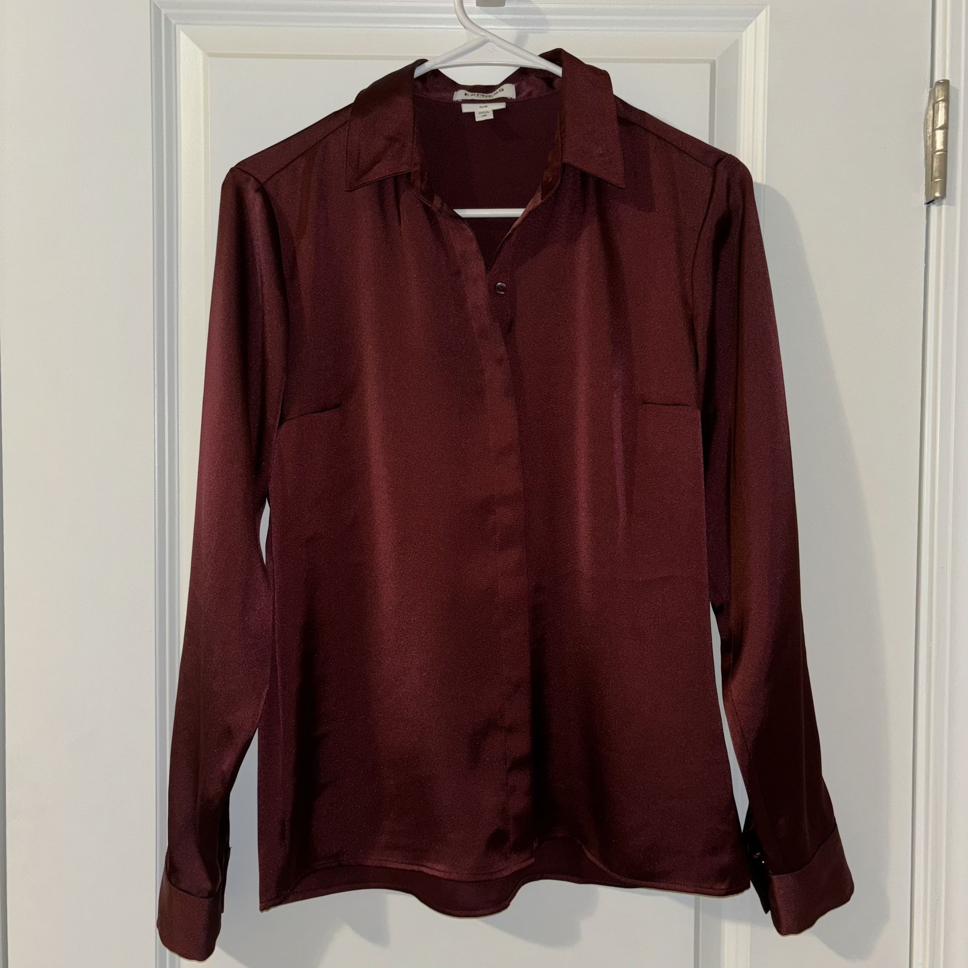 Express Women’s size XS deep burgundy sleek slim fit satin Portofino shirt. Features a point collar, long sleeves with button cuffs, and concealed button front closure. Brand new, washed once but never worn.