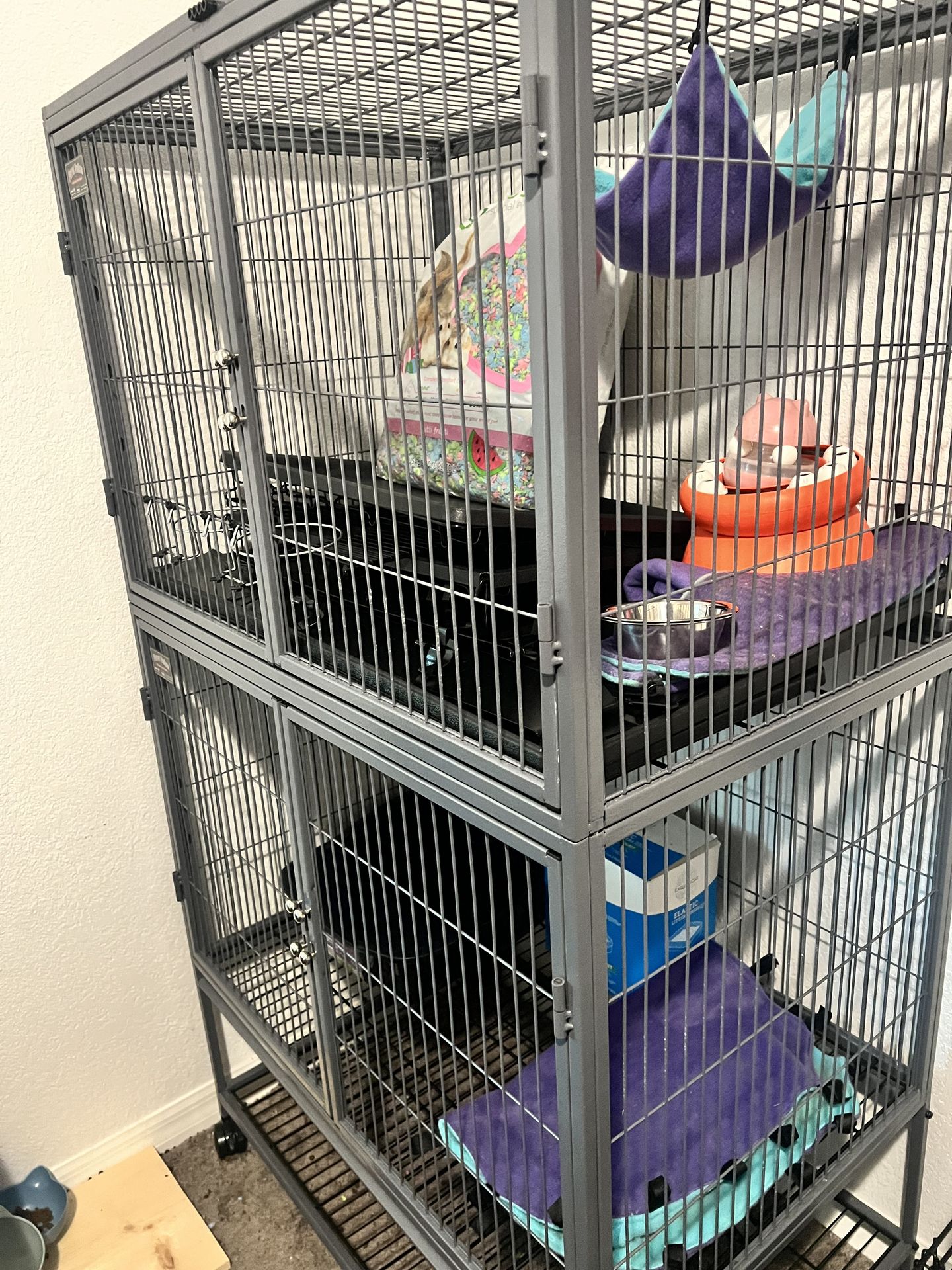 Ferret Nation Cage with extra accessories. Covers for cage, Litter Box, stuffing, food bowls, Attachment added so food bowls are held tightly so ferret or animal doesn’t knock over bowl. Toy for play time. Hammock for ferret sleep time.