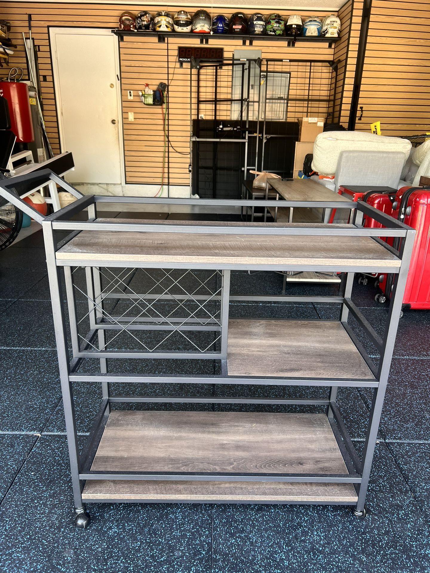 Perfect Condition 31 Length/14Depth/33 Height (35 Length if including handle) Wood with Black Handles 4 wheels- easy to move around Wine Bottle Rack Wine Glass Rack