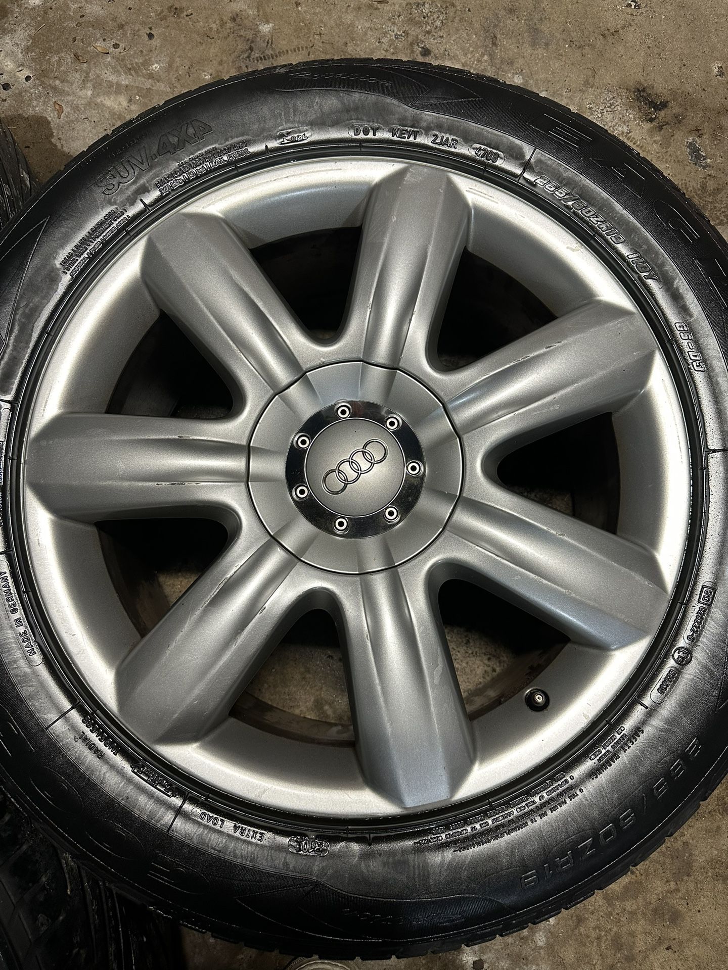 Selling a full set of Audi q7 OEM 7 spoke wheels and tires. Came off a 2009 Q7 Rims are 19s 19x8.5 Offset 62 Bolt pattern 130mm No cracks and no bends! Made in Austria Tire brand Good Year 265/50/19 Cash only no trades. $550 obo