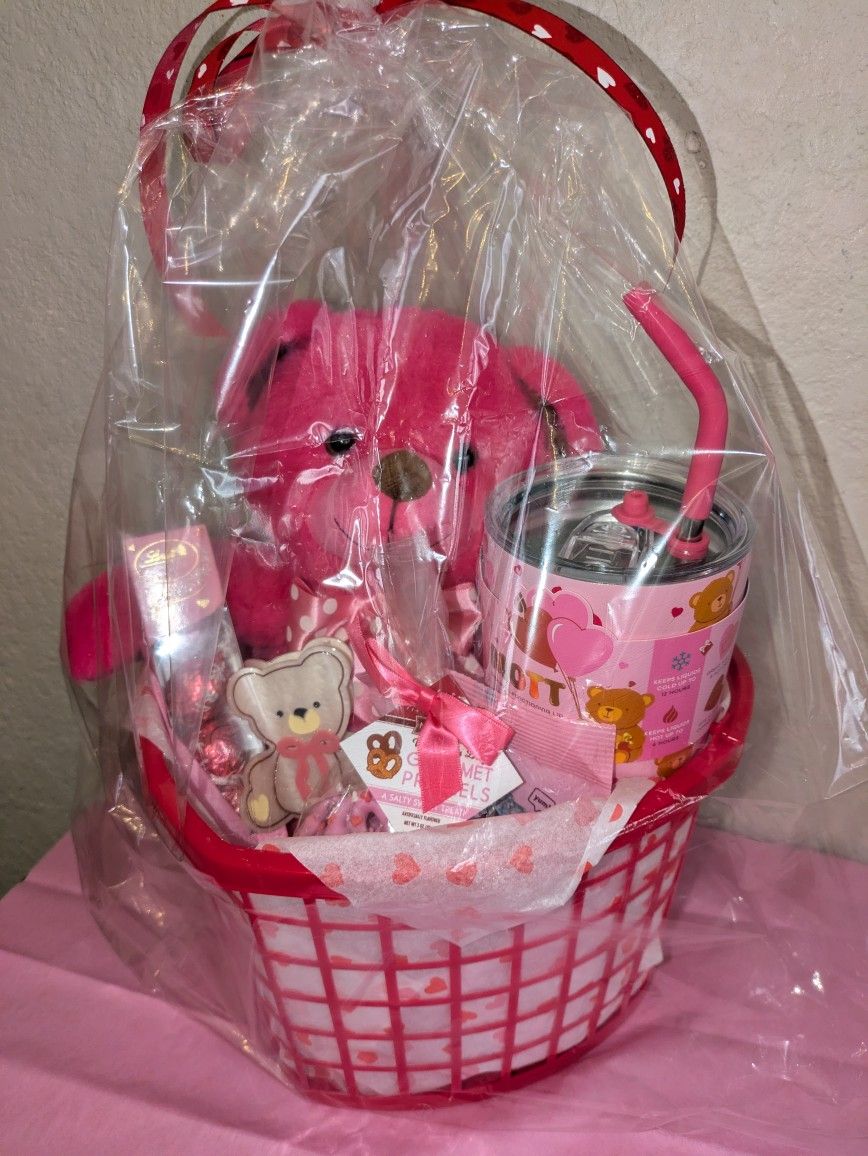 Beat themed valentines basket includes: •Red heart shape basket w/ tissue paper and pink paper grass •Pink bear with pink bow •Bear shaped hair clip •Pink Bear print tumbler •Bag of Hershey kisses •Bag of chocolate covered pretzels •Strawberry Lindor Chocolate truffles. Must pick up in 78210 area or 78237 area, please message for pick up address.