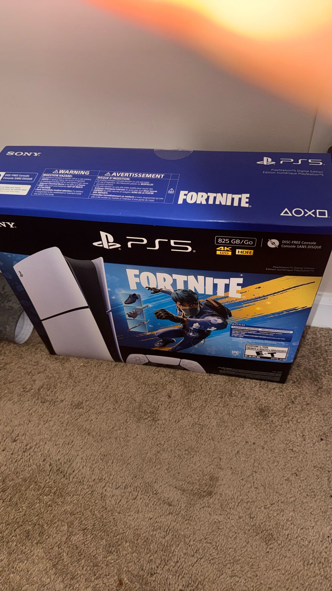 BRAND NEW PS5 DIGITAL, INCLUDES FORTNITE BUNDLE WITH 2,000 VBucks, CONTROLLER, HMDI AND STAND