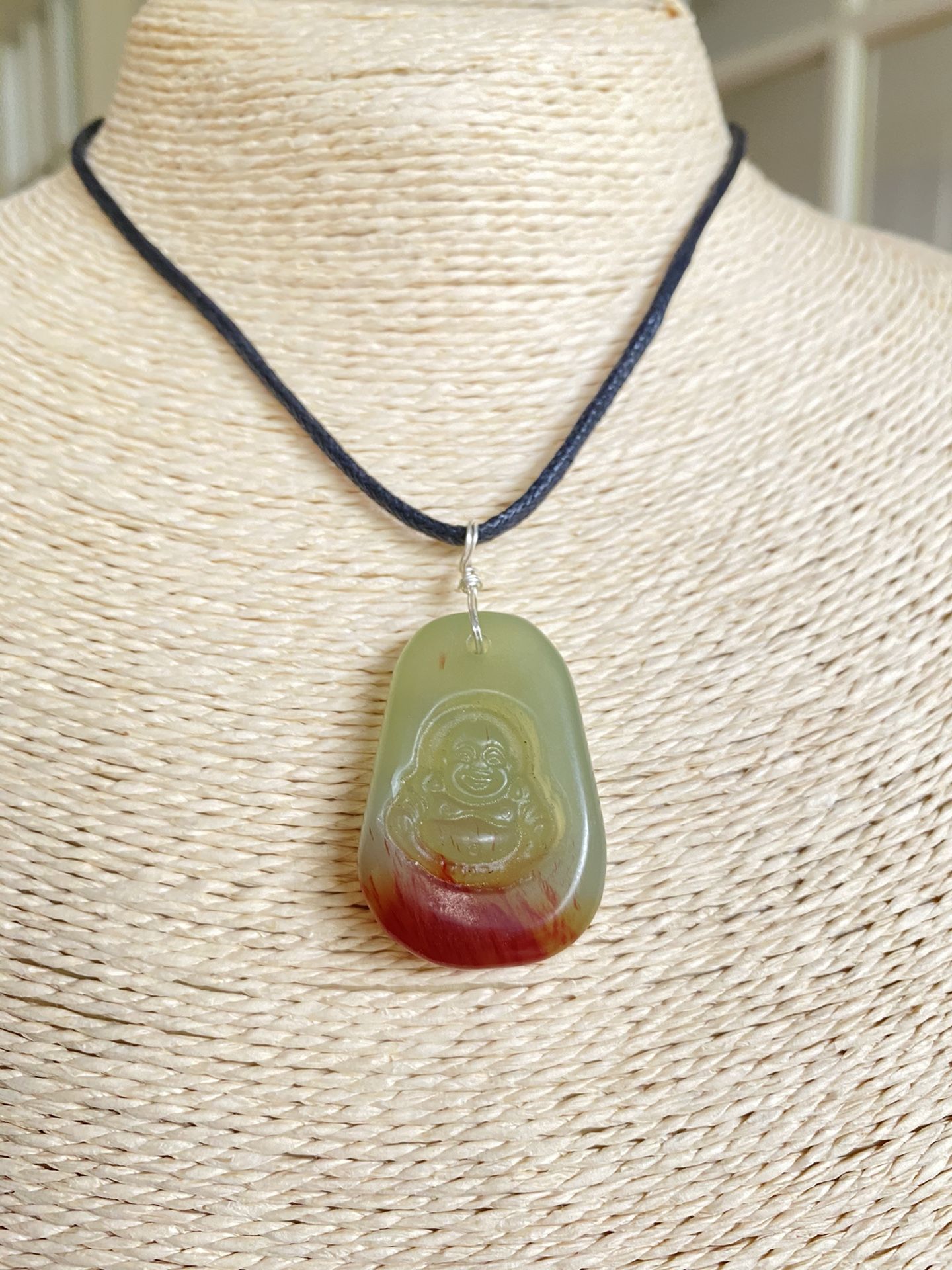 High-grade AA natural red and white jade with natural texture. Hand-carved happy Buddha sitting in the central Buddha box. Unique ornament. Will bring you luck and happiness! Black silk rope necklace can be adjusted in size unisex