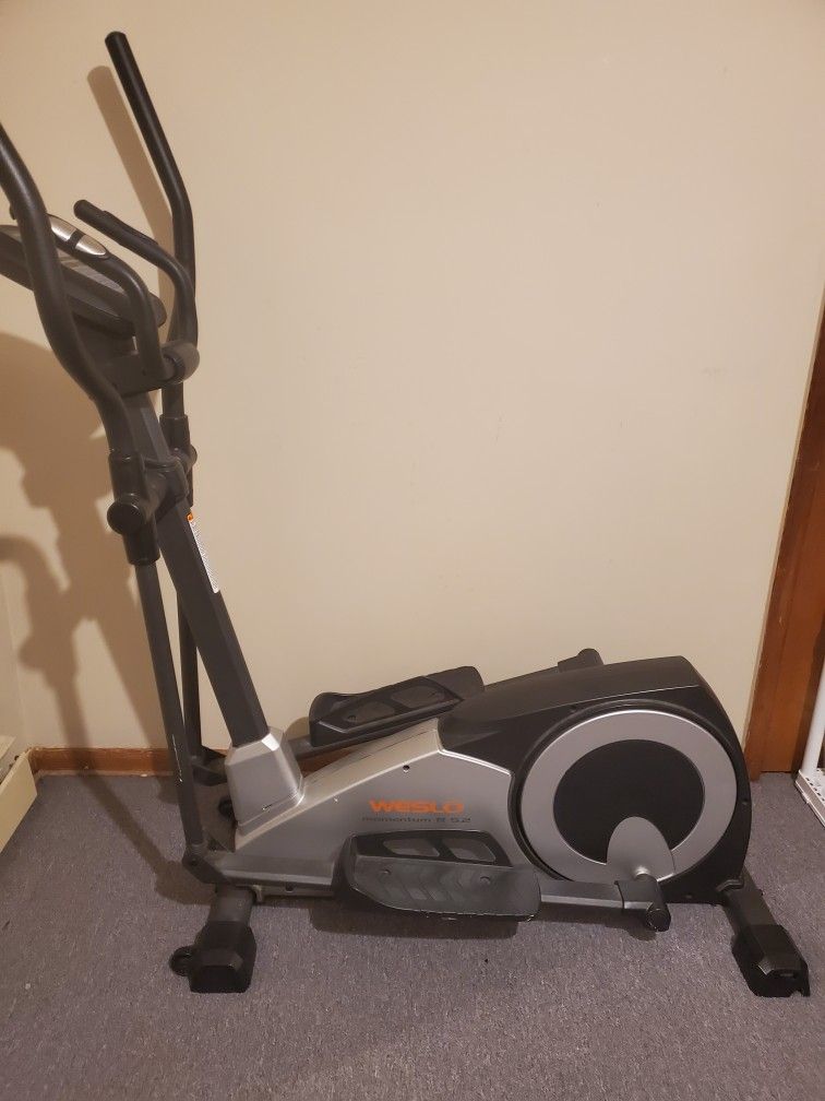 Elliptical machine used, has 6 different workouts included, includes heart rate monitor, keeps track of time, counts calories, needs grease because it squeaks, good condition otherwise, only pick up on weekends,