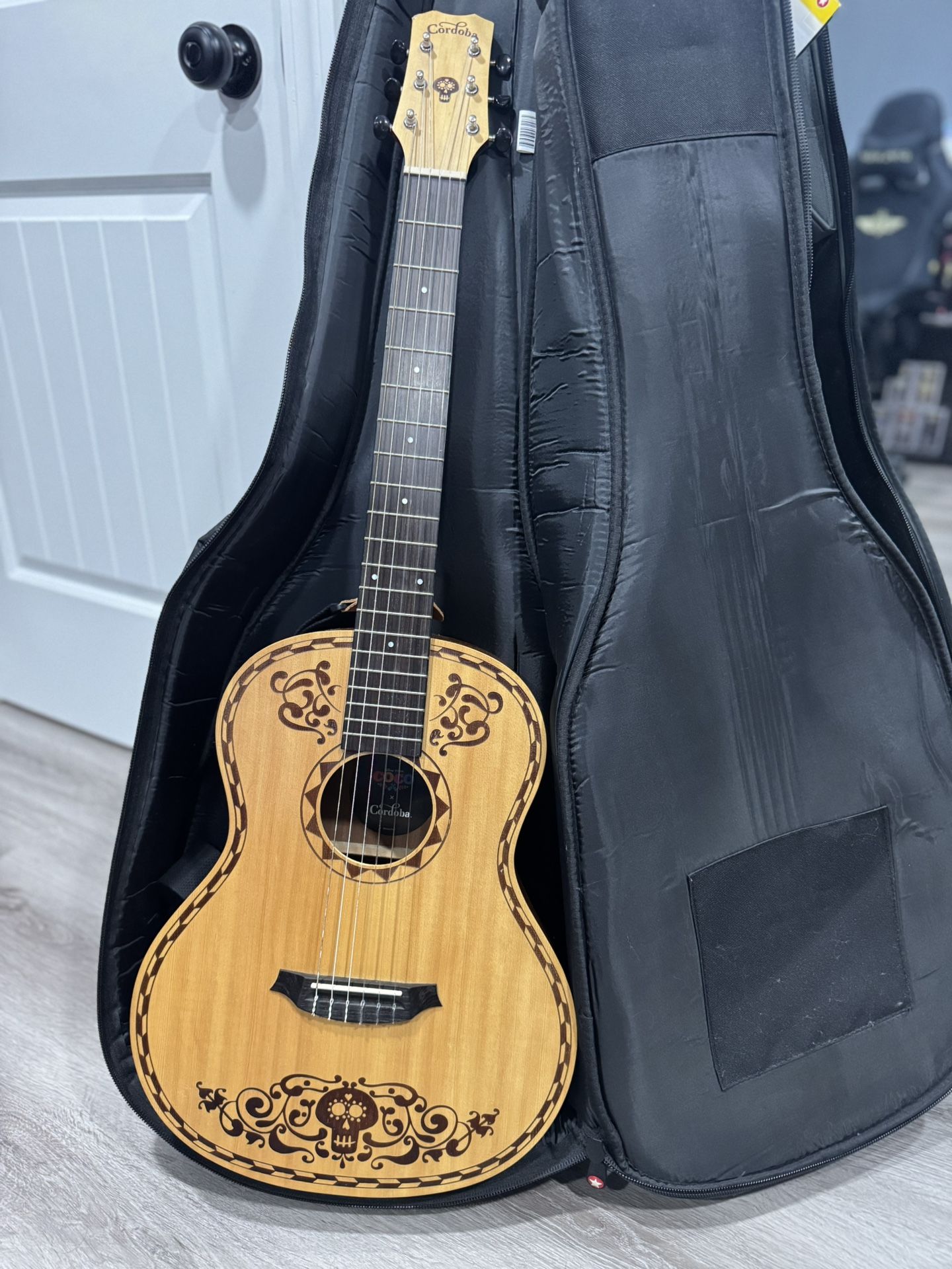 Hello! Here I have the Cordoba Pixar Coco Acoustic Guitar. This guitar based on the hit movie Coco. I’ve had this since October 2017. Originally it was bought as a birthday gift but the person it was intended for passed away. It was taken out of the box but after that it was safely put away in storage inside a brand new road runner guitar case. Over time it has been forgotten until now, selling this guitar w/ the brand new road runner case together for $400 OBO cash only. I don’t need help selling this, thank you.