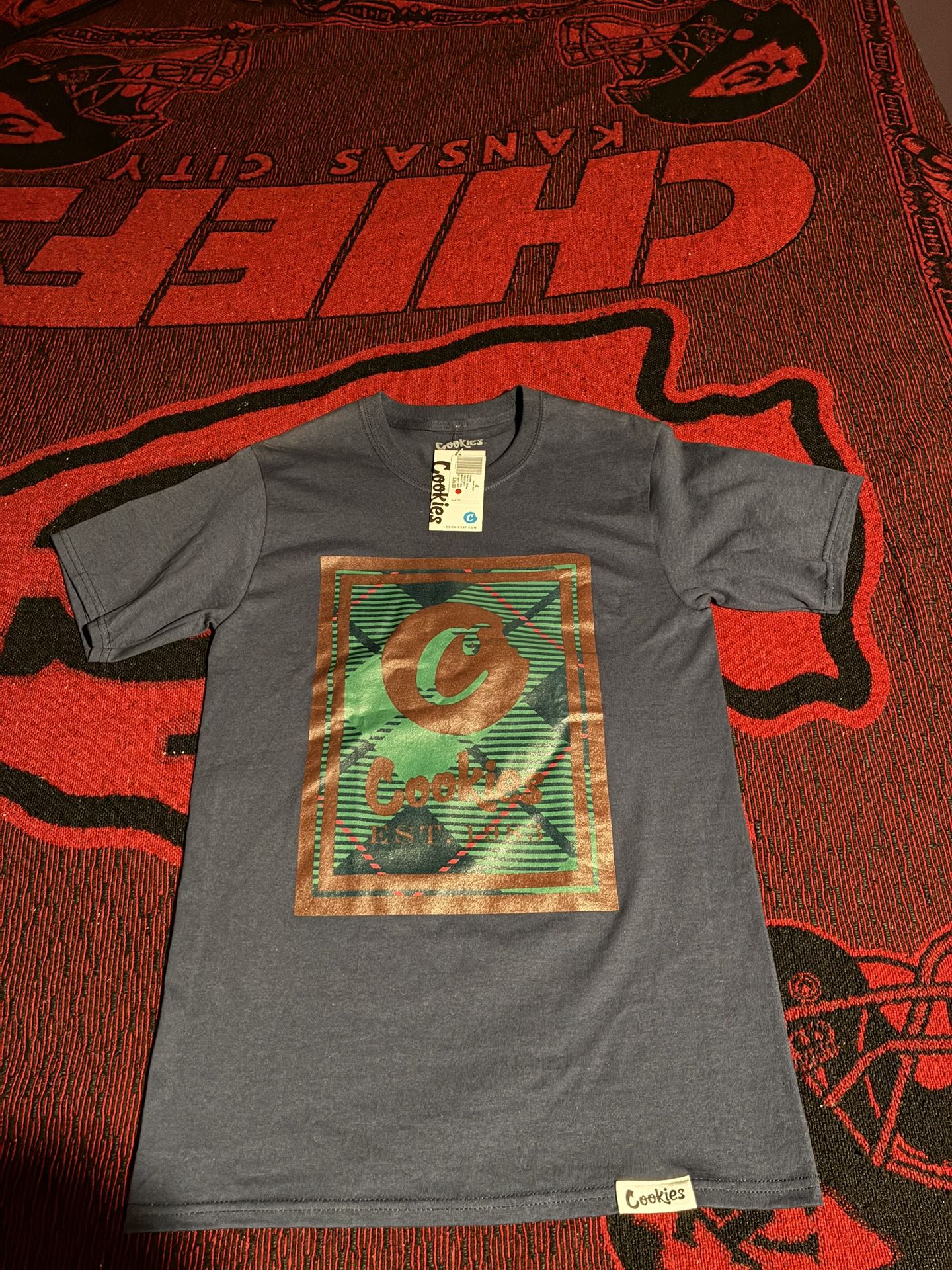 Authentic Cookies graphic t-shirt in navy blue. Features a bold front graphic with metallic/green tones and “Cookies Est. 2011” branding. High-quality 100% cotton tee. Clean, no flaws.